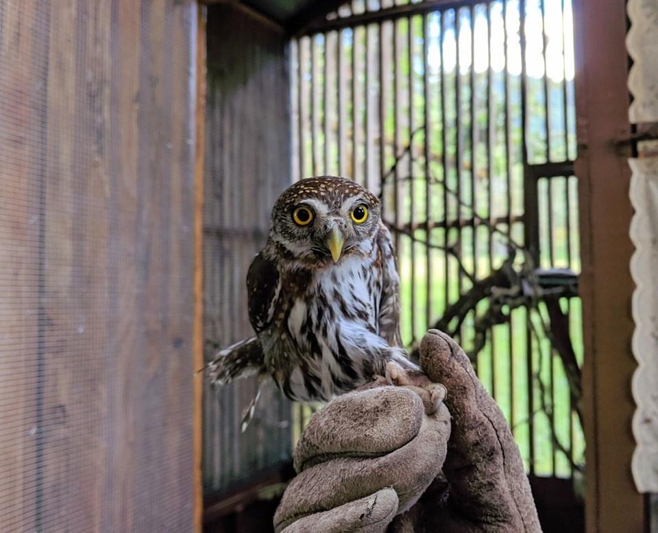 This is a Pygmy Owl rescue that is now an educational bird here locally. It broke a wing and sustained nerve damage so it now visits local schools and groups for those that would like to learn more about wildlife and animal rescue. If you ever come across an injured wild animal, call Umpqua Wildlife Rescue at their hotline at 541-440-6895