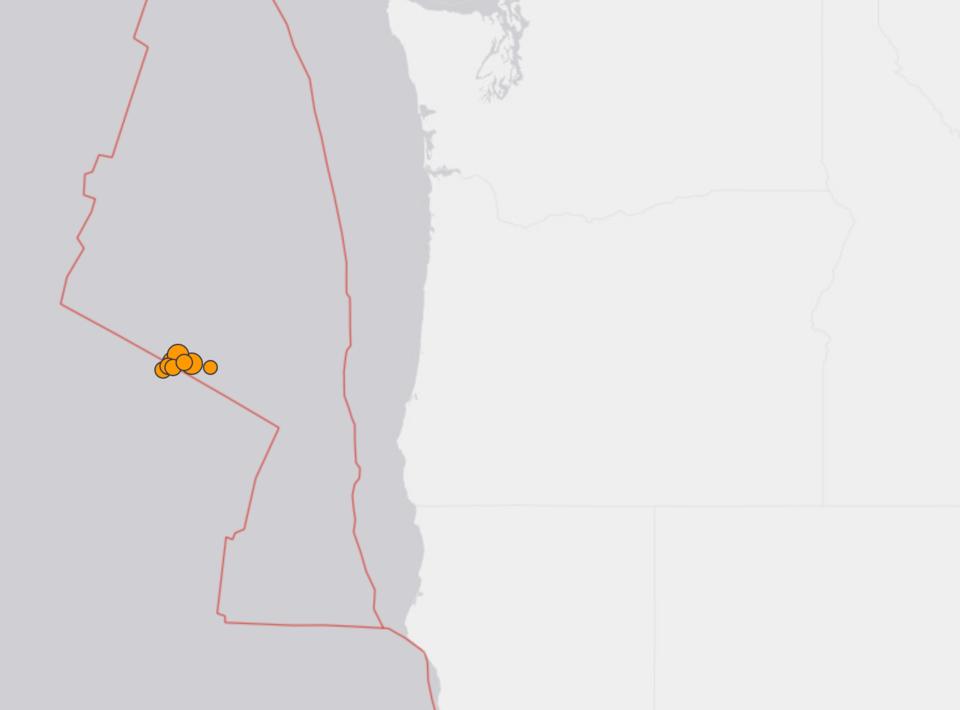 Update from Philip Ong: "This is an interesting glimpse of normal earth movements... A fault came unstuck and is catching up on the plate movements that surrounded it, but it’s not a traditionally dangerous fault and nothing to worry about. It’s a transform fault so has the wrong geometry for very hazardous tsunami, so no worries there, and generally it’s better that it’s releasing energy in lots of smaller events rather than one large one. We can be thankful about that!" Thanks Philip! An earthquake swarm has been taking place a few hundred miles off the Oregon Coast early this morning. In order, the quakes registered 5.0, 5.4, 5.4, 4.2, 3.1, 4.2, 4.7, 3.2, and 4.6. The first quake occurred at 5:43 am and the most recent one occurred at 7:26am. I will update this post with more info soon.