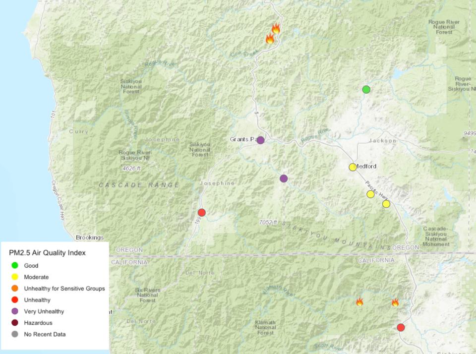 Very unhealthy air in Grants Pass and surrounding areas due to MP97 Fire on Saturday