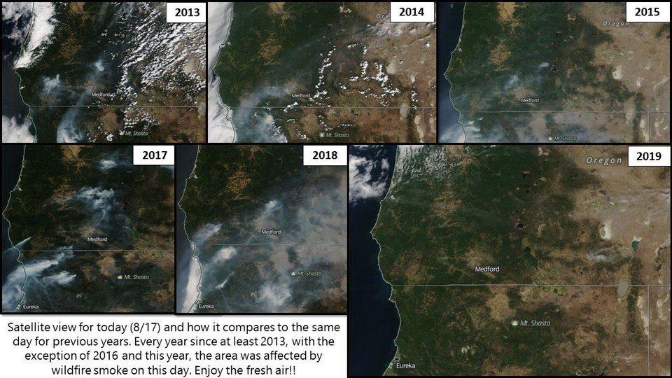 What's different about the air right now? No smoke! Here's what the air looked like on today's date over the past several years. Satellite images compiled by NWS