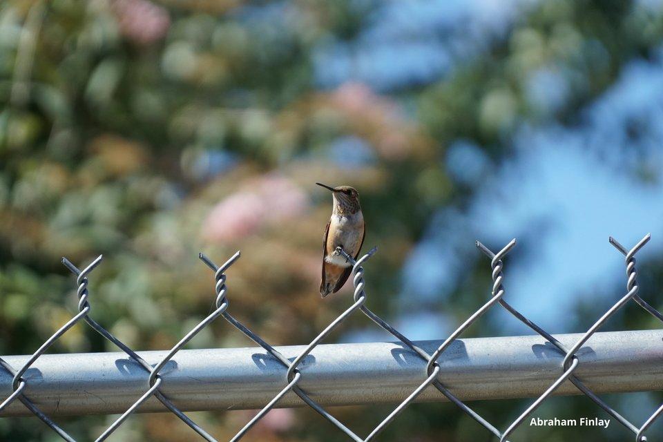 A Rufous Hummingbird rests atop a chain link fence. Photo by Abraham Finlay