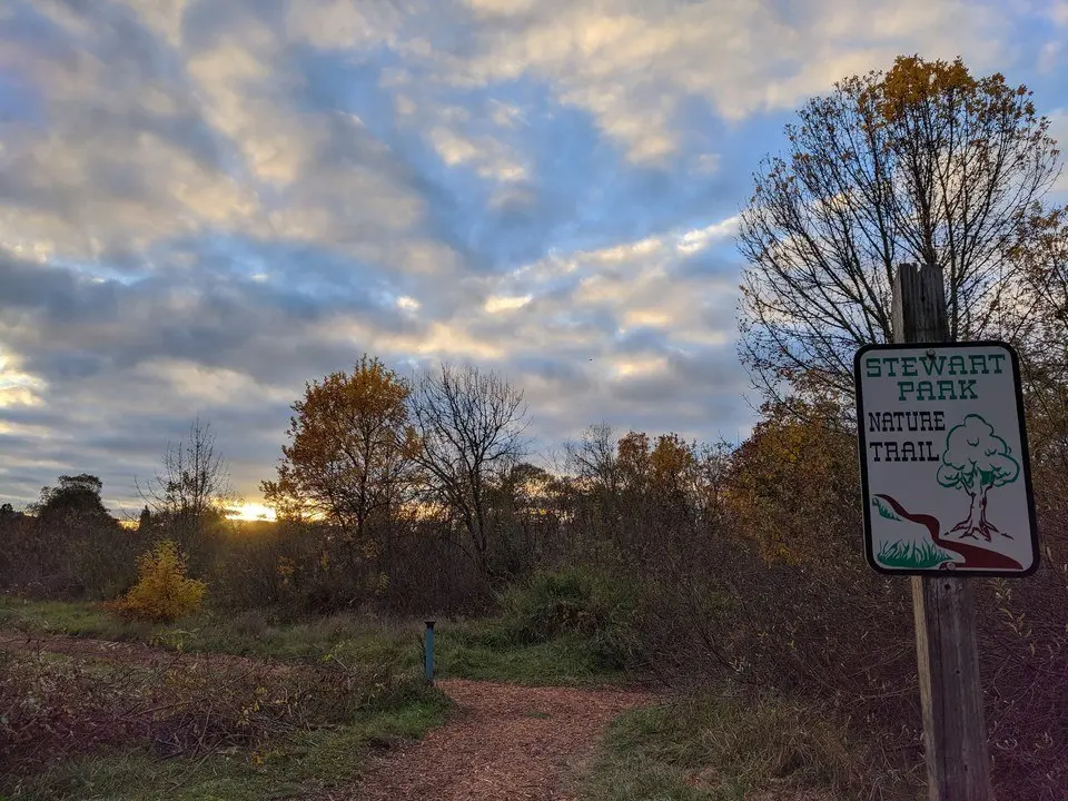 The entrance of the Stewart Park Nature Trail tonight along with a beautiful sunset 🤙