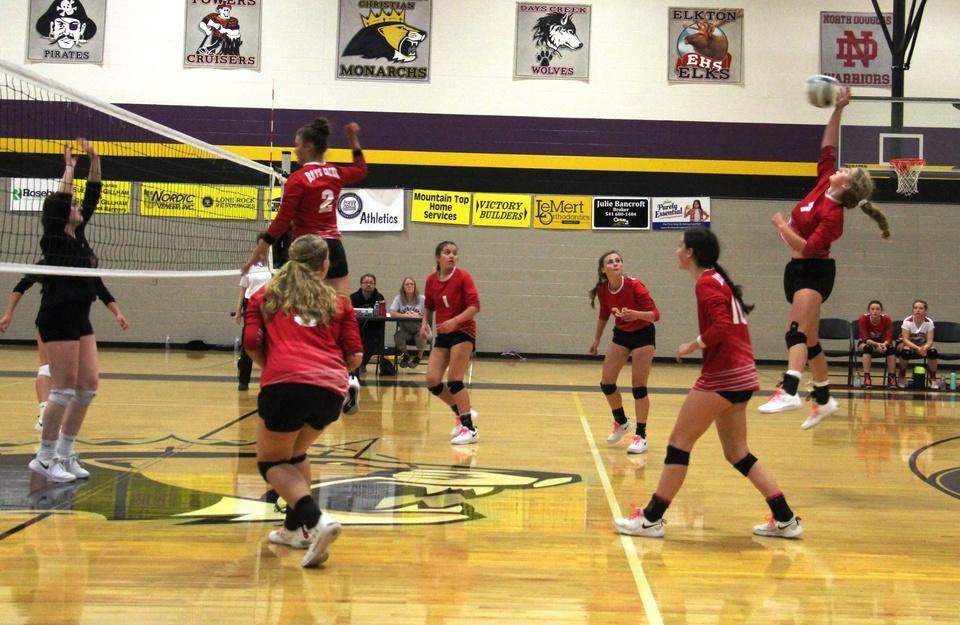 The Days Creek volleyball team defeated North Douglas in the Skyline League tournament championship in five sets Saturday. Days Creek will host a second round state playoff game next Saturday. Set scores 23-25, 23-25, 25-12, 25-10, 15-13. Joleen Crume had 21 kills and seven digs to lead the Wolves (26-2). Moriah Michaels had 11 kills and 24 digs. Shandiin Newton had 13 digs while Ashlyn Slater 15 kills and nine digs. Megan Kruzic had 34 assists. “It was a battle, we had some super long rallies,” Gloria Kruzic said. “They dug everything. We were down two sets. I was proud of our girls and how they battled. It’s easy to get down on each other but the girls stuck with it.” Moriah Michaels, Ashtyn Slater and Megan Kruzic were all nominated Skyline League all-tournament team. Gloria Kruzic said “Joleen Crume carried us the whole game.” On 42 hits she had 21 kills and only three errors. “It feels good to go undefeated in league,” Gloria Kruzic said. “But were looking forward to the final site (state tournament) now and actually competing at the state tournament.” Days Creek will get a bye in the first round of the state playoffs. North Douglas will host a first round state playoff game this coming Wednesday. Elkton who Days Creek beat earlier on Saturday in straight sets (3-0) will play on the road in the first round on Wednesday. (Photo by Debbie Fuller Days Creek's Moriah Michaels goes up for a fake in the front row while Joleen Crume attacks from the back row)