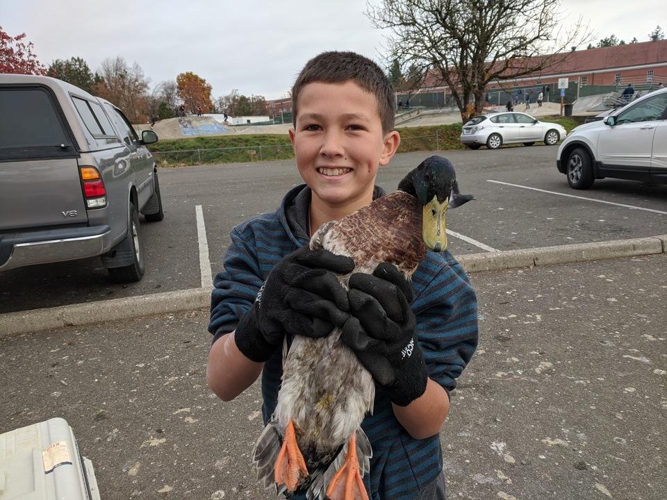 Abraham successfully captured another injured Mallard today at the duck pond. We saw it limping around the other day and weren't able to get it but by today it wasn't walking around at all. We distracted it with some food and Abraham grabbed it. It has some sort of injury on both feet. Poor thing devoured a full cup of bird seed very quickly after being put in the carrier. We already dropped the duck off with a Umpqua Wildlife Rehabber. As always we will keep you posted on its progress! 🤙🦆
