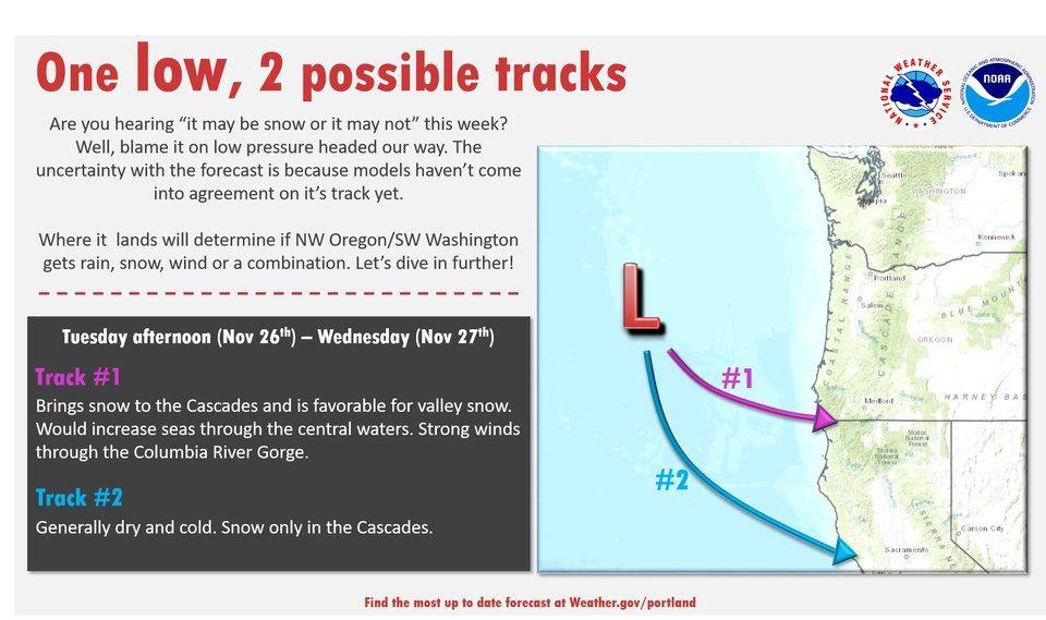 Uncertainty in where the low comes onshore is creating forecast challenges. Here are the two most likely scenarios, both of which keep most of the moisture to our south, with heavy snow over the south Cascades. But either way we will see breezy east wind conditions by midweek. Via NWS