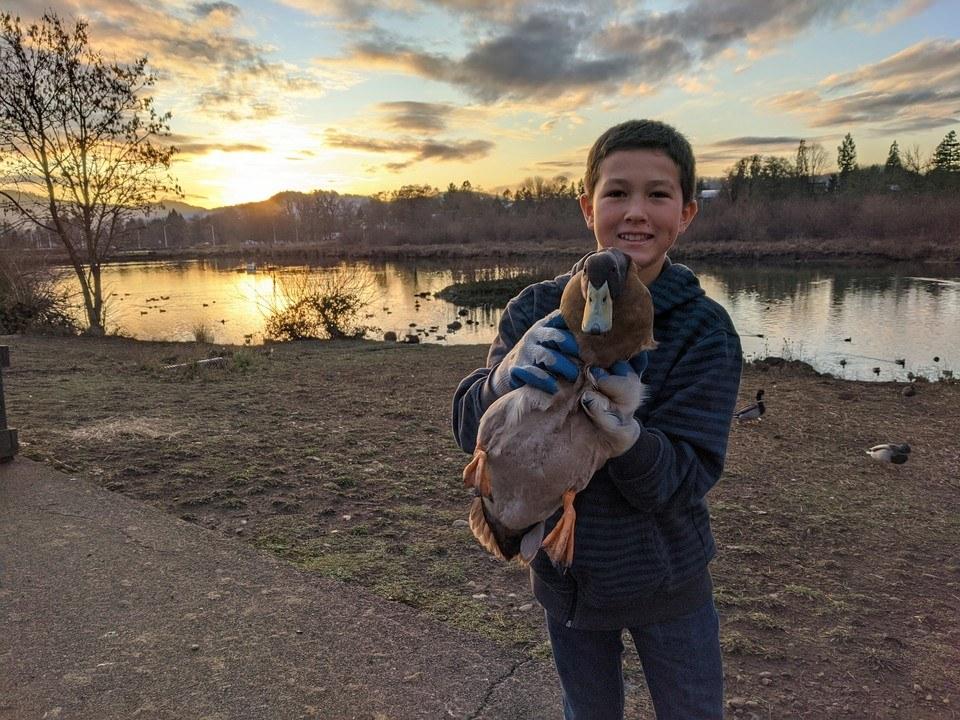 Beautiful night for a duck rescue! This mallard can barely walk and can't really put any pressure on its foot. Off it goes to Umpqua Wildlife Rescue :-) Thanks again Abraham for your help in catching it!