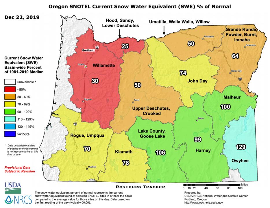 Already off to the slowest start for snow season in five years, things likely won't be getting any better soon. There is more dry weather on the way and there is no storm system in sight right now. For Roseburg, it should be dry but cold for most of the week with temperatures hovering between the 30s and 40s. Here are the snow pack levels at 5,400 ft Mt Hood on this day since 2009. In Inches: 2009 - 61 2010 - 64 2011 - 40 2012 - 76 2013 - 25 2014 - 17 2015 - 69 2016 - 67 2017 - 44 2018 - 40 2019 - 22