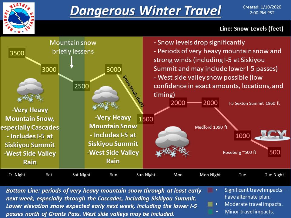 Very difficult mountain travel expected, especially through the Cascades. A period of very active and increasingly cold weather begins tonight and continues through at least early next week. Snow levels will be below most major pass level through the duration of the event, so snow impacts in the mountains are certain. There are two periods where very heavy snow is certain: tonight into Saturday and again Saturday night into Sunday night. East side locations will see periods of moderate snowfall along with gusty winds and blowing snow at times. It becomes much colder with snow levels lowering to the valley floors Sunday through at least mid-week. The Cascades are certain to get heavy snow again during this timeframe. The occurrence, timing, and potential amounts of lower elevation snow remains uncertain, however, snow impacts over the lower I-5 passes north of Grants Pass are likely at times Sunday night through mid-week. If you must travel during this period of wintry weather, be sure to carry an emergency travel kit with you. This travel kit should include: blankets, food, water, fully charged cell phone, chains, and any necessary medications. Be sure to check the latest road conditions before venturing out and stay up to date with the most recent forecasts. Links for this information are listed below: For an in depth discussion on the coming weather systems: https://www.wrh.noaa.gov/total_forecast/getprod.php?new&prod=XXXAFDMFR&wfo=mfr Oregon road conditions: http://www.tripcheck.com/ NWS hazard viewer: https://www.wrh.noaa.gov/map/?wfo=mfr