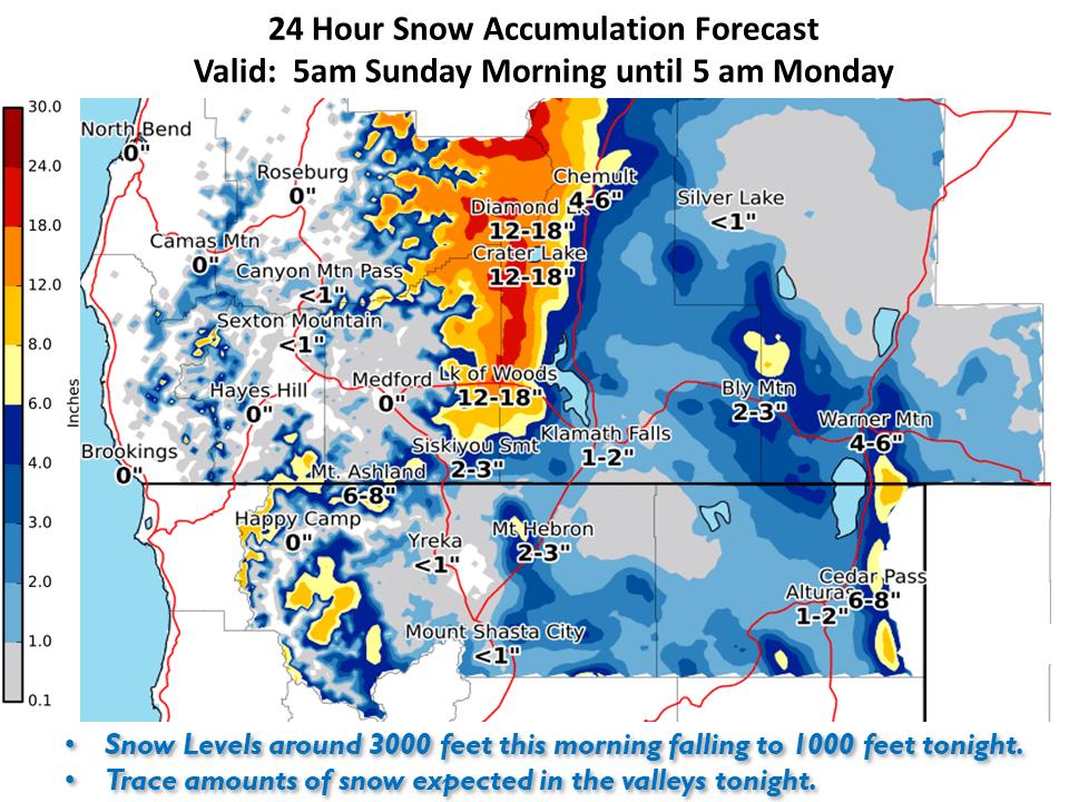Area Forecast Discussion National Weather Service Medford OR 2:51 PM PST Sun Jan 12 2020 .DISCUSSION... Short Term...Tonight through Wednesday Night...A cold front is pushing through the area this afternoon, producing plenty of rain for the lower elevations and snow above roughly 3000 to 4000 feet. Two more waves will arrive through tomorrow night, each enhancing precipitation and reinforcing the colder air in place over the region. We will have a few chances of low elevations snow through Tuesday morning a well. Active weather will continue through the short term period, culminating with the arrival of a strong Pacific storm Wednesday night. Precipitation today will taper off into showers tonight as snow levels lower behind the departing cold front. By sunrise tomorrow, snow levels are expected to be between 1000 and 1500 feet, allowing for snow to fall down to some of the valley floors, particularly in the upper Rogue Valley. However, as precipitation amounts will be on the downswing, we do not expect much in the way of accumulation. Still, the morning commute may be interesting. The next front arrives Monday evening, followed by another weak system Tuesday. Snow levels throughout this time should hover around 2500 feet, with the exception of Tuesday morning when snow levels could drop as low as 1000 feet. This will be the second chance for lower elevation snow, but this time precipitation rates will remain elevated, and an inch or two of valley snow is not out of the question before snow level rebound later in the day. Meanwhile, throughout all of the aforementioned time, snow will persist across the higher elevations and the East Side. this is especially true in the Cascades, which have seen and will continue to see enhanced snow accumulations due to the westerly flow and strong geographic uplift. Gusty winds will accompany the snowfall this evening and tonight, and there will be additional impacts as a result. For details on snow amounts and expected impacts, see the numerous winter weather warnings and advisories at PDXWSWMFR. As mentioned in this morning`s discussion, model guidance continues to show a significant low forming off the coast Wednesday afternoon and evening. Guidance across all model suites depict this low rapidly deepening as it moves east before moving onshore Thursday. There are still many details that remain uncertain due to the possible tracks the low could take, but signs are pointing toward a potentially strong wind event for the coast, the East Side, and the higher terrain, along with another round of rain and snow. Snow levels are expected to be around 2500 to 3000 feet across the area, and with strong south winds up the Sacramento Valley producing significant geographic uplift, Mt Shasta City and surrounding areas could receive in excess of a foot of snow by midday Thursday. Meanwhile, additional snow is likely for the Siskiyous, Cascades, and much of the East Side. We will keep an eye on this developing system and update the forecast details as confidence increases. -BPN