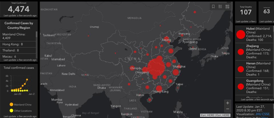 This is a near real time map of all the cases of the Coronavirus around the world. https://gisanddata.maps.arcgis.com/apps/opsdashboard/index.html#/bda7594740fd40299423467b48e9ecf6 For more on the project, read this: https://systems.jhu.edu/research/public-health/ncov/