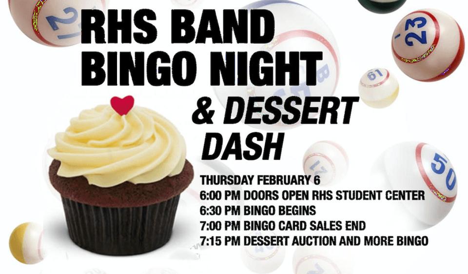 The RHS Band Program will be hosting their annual Bingo night/Dessert Dash in the student center at Roseburg High School next Thursday February 6th. Bingo night helps support the students directly in earning funds for their student accounts to pay for things such as annual band expenses and this years trip to Anaheim for performance opportunities and fun. Proceeds from the sale of Bingo cards can go directly to a student's account with all other proceeds going to the band’s general fund which includes new instruments and music. $5 to play a bingo card for the entire night! You can specify if you want the money to benefit the RHS band program or an individual band student. The Dessert Dash involves each table combining their bids to claim one of the delicious desserts available at bingo night. The table with the largest bid gets first chance at dashing to the table and picking the dessert of their choice! To get your chance at the most delectable dessert, simply complete the bid sheet at your table. Be aware…….you’ll need to bid high to be the first table called and be fast to get your favorite dessert because the next winning table number will be called quickly…..this is the DASH part of Dessert Dash. Where: Roseburg High School 400 Harvard Ave, Roseburg, OR 97471 When: Thursday, February 6 at 6pm