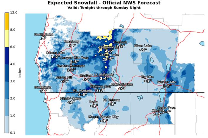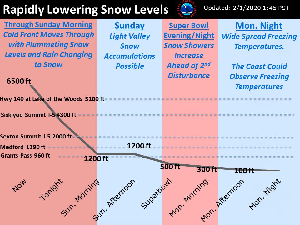 Temperatures and snow levels are going to be dropping significantly late tonight into Sunday morning. Here is the latest weather forecast from the National Weather Service out of Medford. 311 PM PST Sat Feb 1 2020 SHORT TERM...The bands of precipitation have reached the cascades and are starting to spill over to the east side. This first system will see snow levels dropping down to the passes on I-5 by Sunday morning. The next system will arrive in the cooler air mass with 850 MB temperatures lower than -35 C moving over the area by Sunday afternoon. With this the high temperature will likely be seen late morning or early afternoon, with temperatures dropping after that. By late Sunday afternoon snow levels are expected to drop to below 900 feet. Currently models are indicating the greatest precipitation rates will be Sunday evening, and although precipitation amounts are indicating as low, with the cold air mass over with warmer temperatures lingering at the surface, there will be enough instability to bring the possibility of thunderstorms inland to the coastal ranges, with the possibility of stronger showers further inland causing isolated and brief heavier precipitation rates and amounts. With any thunderstorms that develop, snow levels may drop briefly to the ground even to the coast Sunday evening into the overnight hours. Have extended the winter weather advisory to include all inland areas west of the Cascades, and with the models showing a little later timing, have extended the advisory out until the wee hours of the morning. A cold air mass remains behind the front and with weak offshore flow below freezing temperature will be possible all the way to the coast by Tuesday morning. The next system slides into the region on the back side of an upper level ridge Wednesday, but the cold air mass aloft will have shifted east and snow levels should be above the I-5 passes by late morning and above the I-5 passes by mid afternoon. Sven Long Term...Wednesday morning through Sunday morning...An offshore ridge will keep most of the extended forecast relatively dry. There are some variations within model solutions showing disturbances riding over this ridge. Therefore, northern Coos, Douglas and Klamath Counties have some light precipitation amounts included in the forecast. The pattern through Friday will be generally warm, with progressively less cloud cover each day. High temperatures are currently expected to reach or slightly exceed normal for the month of February on Thursday and again on Friday. For reference, Medford and Roseburg have a normal of 54 (F), North Bend has a normal of 53 (F), Klamath Falls has a normal of 45 (F), and Lakeview has a normal of 42 (F). Friday evening and into the weekend though, there is agreement that the ridge could begin to break down. Meaning more wet and dynamic weather will return to southwest Oregon. At this time there are still some significant model differences, the GEFS have the precipitation coming earlier in the weekend and weaker, but most ECMWF ensemble members do not show precipitation in our area until later on Saturday. Some of this has to do with the ECMWF developing a deepening surface low, while the GEFS does not and keeps the feature as an upper level wave. Currently it appears that the NBM is not handling this pattern well, keeping southwest Oregon dry, and so relied on a a combination of the SuperBlend, mixed with some deterministic model data. At the moment, the main impact appears to be strong north winds in the marine waters, which would lead to at least small craft advisory conditions. -miles