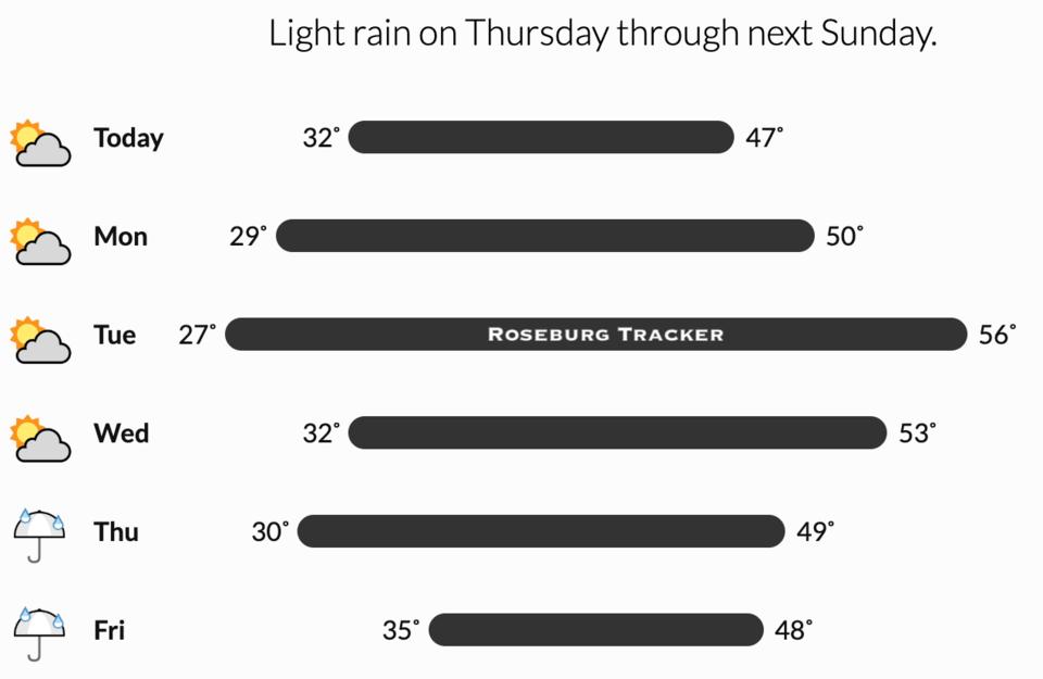 We should be getting quite a bit of sunshine in the area through Wednesday. Temperatures will also be rising at least until Tuesday which is expected to have a high of 56 degrees. (NWS Discussion) Short Term - Today through Thursday morning...Sunny skies prevail across the forecast area this afternoon, except for in the Umpqua Basin where persistent stratus clouds linger. For those who enjoy these sunny skies, you're in luck as this will be the general theme for the weather through mid-week. However, if you're one for cloudy days with precipitation, sit tight, we'll get back to that towards the end of the week. Long Term - Thu 13 Feb through Sun 16 Feb 2020. The breakdown of the offshore ridge will be pretty much completed by the beginning of the extended period, and the pattern will become progressive with low amplitude upper troughs and ridges traversing the area. The strongest trough in the series will move onshore Thursday or Thursday night, pushing a cold front onshore Thursday. The deterministic and ensemble solutions of both the EC and the GFS support this scenario. Precipitation will move in Thursday afternoon, and post-frontal showers will persist into Friday. Amounts will be widespread but mostly light with the bulk of it falling along the north coast, Umpqua Basin, and the adjacent Cascades. Ridging will briefly redevelop after this front moves in, so Friday night will be drier, but the next upstream trough will push another front onshore Saturday or Saturday night. Post-frontal showers will then persist into Sunday. Overall, this system will be wetter and windier than the Thursday system, but it will still rate as a light precipitation event and no flooding issues are anticipated. Wind advisories may be necessary over the east side if the current forecast holds though.