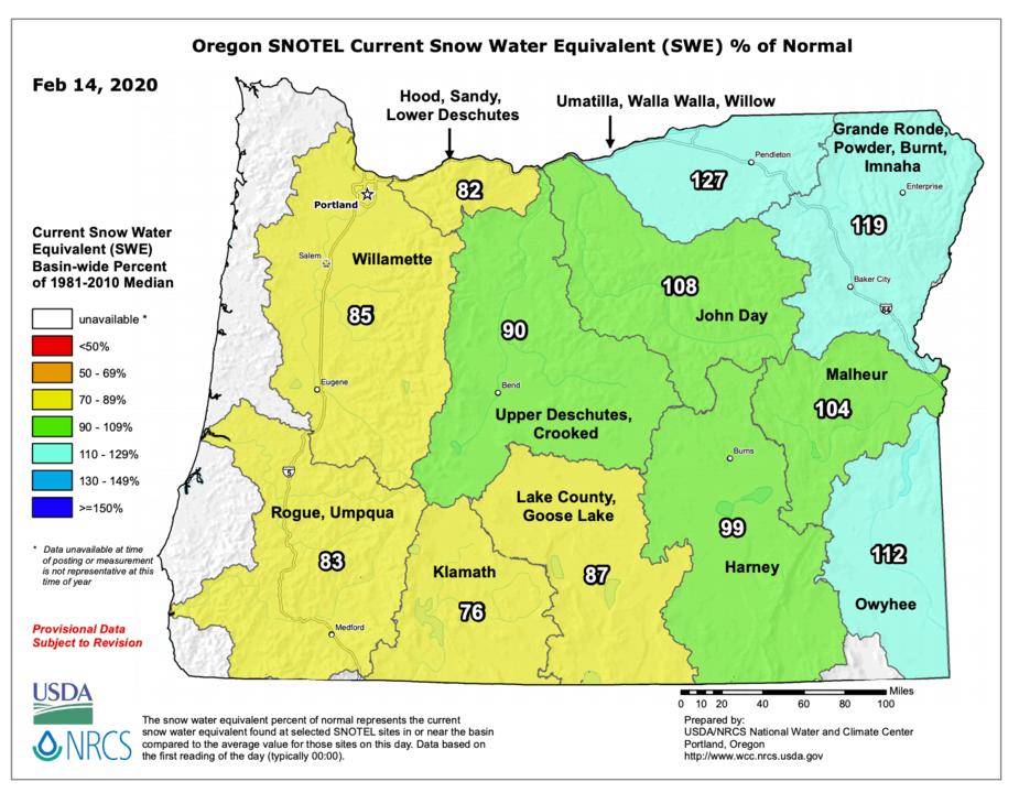 The Umpqua and Rogue snowpack level is sitting at 83% of normal for the year. It's surprising because of how mild the winter has been. The storms in mid-January that dumped several feet of snow really helped. Eastern Oregon is sitting at above average snowpack and the Cascades are just a little below normal. More snow should fall in the Cascades this weekend.