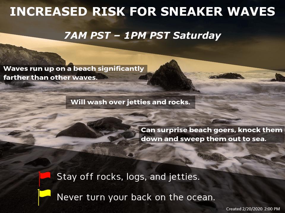 (NWS) Dangerous sneaker waves are possible Saturday along the Oregon coast from Reedsport to Brookings. Sneaker waves are waves that can surprise beachgoers, running up on beaches significantly farther than other waves or over outcroppings. Beachgoers can be knocked down and dragged into the very cold ocean by these waves resulting in injury or drowning. Logs and other debris can be tossed around and people can become trapped under them. Never turn your back on the ocean! Stay back from the waves and avoid climbing on rocks, jetties or logs. If you see someone swept into the ocean, do not swim in after them. Call 911 and keep an eye on them until help arrives!