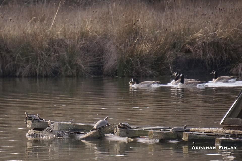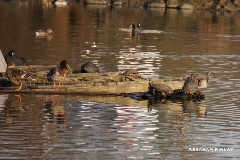 Seven turtles were out basking in the sun in the north pond in Stewart Park this afternoon. There were six Western Pond Turtles and one invasive Red-eared Slider turtle in the group. The Red-Eared Slider is a turtle from the eastern U.S. It has a dark shell, yellow stripes on the neck and legs, and a bright red patch just behind the eye. As an invasive nonnative species in Oregon, they compete with native turtles for food and habitat, especially nesting sites. They can spread diseases to which Oregon’s native turtles have no immunity. - (Via ODFW) Western Pond Turtles prefer marshes, streams, rivers, ponds and lakes. They need sparse vegetation nearby for digging nests and like to bask on logs. Population declines are due to habitat loss, degradation of nesting areas by invasive plants, competition from non-native turtles and disease. Predators include raccoons and invasive bullfrogs and fish. Photos by Abraham Finlay Here's more information on the invasive Red eared slider turtle: https://www.dfw.state.or.us/conservationstrategy/invasive_species/docs/red-eared_slider_fact_sheet.pdf