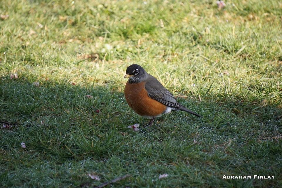 American Robin looking for worms while standing in the early morning dew soaked grass. Photo by Abraham Finlay