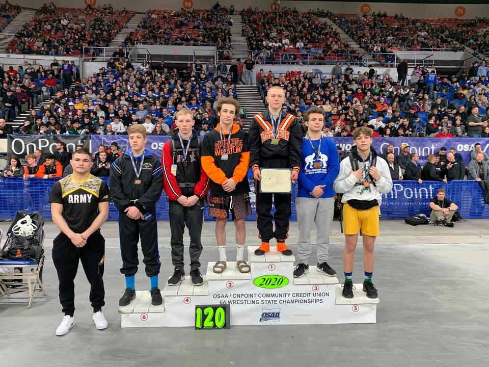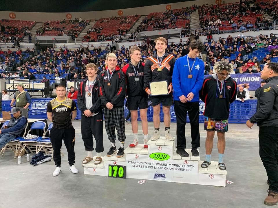 The Roseburg wrestling team took second place as a team in the 6A state championships Saturday but scored two individual state titles. The Indians streak of six straight team state titles came to end. Newberg won the state title with 310.5 points while Roseburg had 262.5 points. Mountain View came in third place with 209.5. "As a team we fell a little short on a lot of days leading up to the season and during in our training prior to," Roseburg coach Steve Lander said. "At the State tournament we fell a bit short. The two go hand in hand. Preparing to win is a lot more important than wanting to win." Roseburg had four total finalists, including two second place finishes. No. 3 seed Nash Singleton won the 120 pound state title with 10-3 decision over top seed Noah Worthington of Sprague. Darian Thacker who was the No. 1 seed also won a state title at 170 pounds, winning a 7-2 decision over the No. 2 seed Cannon Potts of Mountain View. "Nash and Darian have been outstanding all season." Lander said. "The work and focus that they have put into their preparation for the season was on point, their titles were well deserved." Kahleb Diaz (126) and Tristan David (152) also advanced to the Finals in their respective weight classes. No. 2 seed Diaz lost to top seed Ayden Garver of Newberg in a 10-4 decision. David who was the No. 6 seed lost a very close match to top seed Cael Brunson of West Linn in a 3-2 decision. "It's not easy to win a Championship, it's not easy trying to get 61, 14-18 year old's to put in consistent focused training," Lander added. "We needed to be a little better and couldn't do it this weekend." Newberg had 22 qualifiers in the state championships thanks to four additional wild cards they received from the OSAA. Roseburg had 17 total wrestlers in the tournament including one wild card qualifier. Photos of Nash Singleton (120) and Darian Thacker (170) receiving their state championship medals. Photo courtesy of Kim Root.