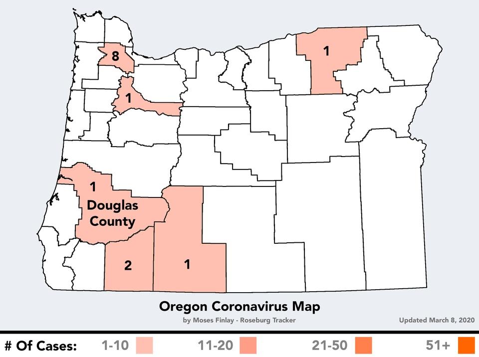 DOUGLAS COUNTY, Ore. - Health officials in Douglas County have identified a presumptive positive case of the novel coronavirus, COVID-19. Dr. Bob Dannenhoffer, the County’s Public Health Officer says the affected individual, a resident of Douglas County, is medically stable. It is believed that the Douglas County case was from community spread. Oregon announced 7 new cases Statewide Sunday morning including 5 new cases in Washington County, 1 in Marion County and 1 in Douglas County. Gov Kate Brown also declared a State of Emergency. This increases the identified cases in Oregon to 14 cases. The Douglas Public Health Network and the Douglas County Board of Commissioners have been engaged with multiple partners for the past month and will continue to work collaboratively. These partners include the Douglas County Emergency Manager, local hospitals, healthcare workers, emergency medical services, the Oregon Health Authority and Oregon Office of Emergency Management. Residents can take everyday precautions to prevent the spread of many respiratory illnesses, including COVID-19 and influenza by taking note of the following: Stay home while you are sick. Never visit a hospital or long-term-care facility if you have a fever or cough illness. Cover your coughs and sneezes with a tissue and then throw the tissue in the trash. Wash your hands often with soap and water for 20 seconds. If soap and water are not readily available, use an alcohol-based hand sanitizer that contains at least 60% alcohol. Avoid close contact with people who are sick. Avoid touching your eyes, nose and mouth with unwashed hands. Clean and disinfect surfaces that are often touched. Take care of your health overall. Staying current on your vaccinations, including flu vaccine, eating well and exercising all help your body stay resilient. Consult CDC’s travel website for any travel advisories and steps to protect yourself if you plan to travel outside of the US. Residents who would like more information on COVID-19 can call 211 or visit the Oregon Health Authority www.oregon.gov/oha or the Center for Disease Control www.cdc.gov