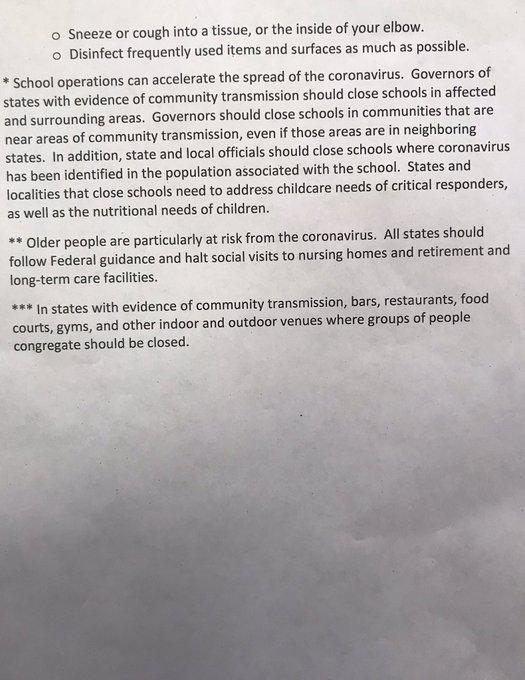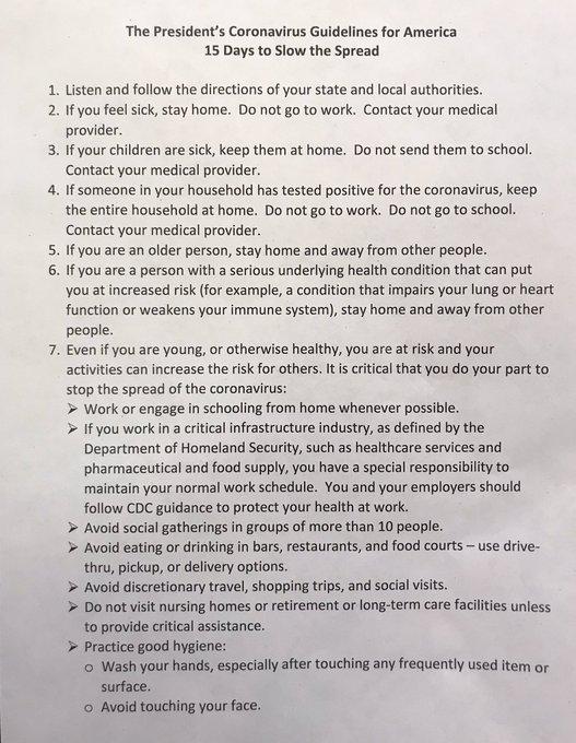 Breaking: “The President’s Coronavirus Guidelines for America: 15 Days to Slow the Spread”. Here is the handout the Whitehouse shared before the briefing to the press. President instructing Americans to avoid social gatherings of more than 10 people for the next 15 days to slow the spread of the novel coronavirus. 1. Asking all Americans to work from home 2. Restrict gatherings to <10 people 3. Avoid discretionary travel 4. Avoid eating/drinking in public bars, restaurants, breweries. Noteworthy: *** In states with evidence of community transmission, bars, restaurants, food courts, gyms and other indoor venues where groups of people congregate should be closed. This would apply to Oregon. Expect Oregon Gov to respond accordingly later today. More to come. Source of handout: Geoff Bennett @GeoffRBennett White House Correspondent@NBCNews