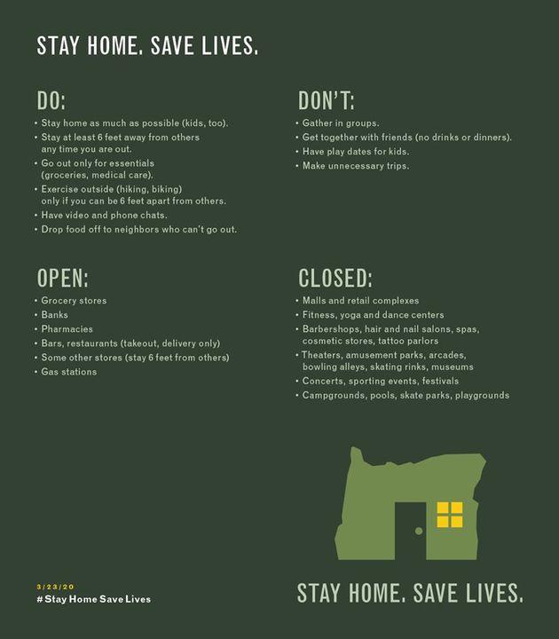 "I want to make it perfectly clear what's allowed and what's not under my new Executive Order. If you're still not sure about an activity, skip it. Staying home will save lives. These social distancing measures are designed to stop the spread of COVID-19 and be more sustainable over time, preserving scarce hospital space and allowing more Oregonians to keep their jobs when their work does not add to the growth of COVID-19 in Oregon."
