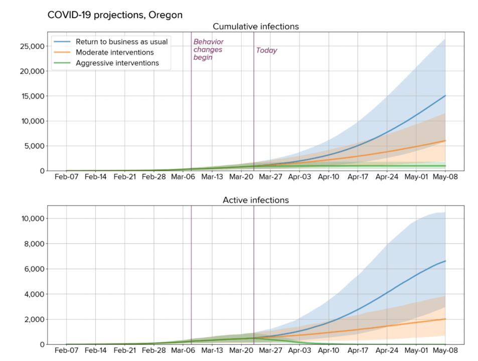 (State of Oregon Release) (Portland – March 26, 2020) The fight against the coronavirus depends on Oregon hospitals having enough beds to treat the coming surge in patients who will become seriously ill with the virus. Today, Oregon health officials and hospitals announced a joint statewide action plan to dramatically bolster the state’s ability to treat people with COVID-19 illness who need hospital care. The plan was developed by the “Governor’s Joint Task Force for Health Care Systems Response to COVID-19,” convened by the Oregon Health Authority (OHA). It includes a broad range of health systems, health care providers, human services organizations, public health and public safety agencies, insurers and other organizations needed in the battle. The plan addresses 4 urgent actions necessary to expand the health care system’s capacity and maintain its capability as Oregon braces for a projected spike in new coronavirus cases: Procure and distribute critical medical supplies, including personal protective equipment (PPE) for health care workers and ventilators. Optimize hospital capacity to be able to treat COVID-19 cases. Mobilize the health care workforce to respond to COVID-19. Maintain a unified, coordinated and transparent emergency response to COVID-19. New projections of COVID-19 cases in Oregon show the state is at a critical moment in the fight against the disease. Social distancing measures could alter the trajectory of new infections, which gives Oregon’s health care system the chance to ramp up to meet the coming surge. But the state has little margin for error. A return to “business as usual” or slight differences in actual infection rates (compared to projected ones) could swamp hospitals with more coronavirus cases than they could treat. Governor Brown said, “Hospital leaders and health officials are doing their part to find beds, secure supplies and protect health care workers. Oregonians can make a difference too: stay home and save lives. We all have a role to play in an unprecedented, unified effort across Oregon to stop the coronavirus from taking the tragic toll we’ve seen it claim elsewhere.” State agencies, hospitals and health care providers have already begun to implement the plan. The state is collecting PPE for re-distribution to facilities in need. Regional hospitals have signed mutual aid agreements to shift equipment, workforce and patients from overburdened facilities to others with adequate capacity. The state is working with providers to stand-up alternate care locations (such as the Oregon Medical Station), identify and develop new alternate care sites, enable ambulatory care centers to house patients and re-purpose long-term care facilities. The state and hospitals are sharing hospital bed utilization data so hospitals can manage the use of beds and equipment across their region. The state is developing childcare options for health care workers, so their work isn’t interrupted by school closings and family responsibilities. OHA Director Patrick Allen said, “Oregon’s health care system began preparing for a pandemic years ago, which gave us a head start on this plan. From expanding testing to securing more ventilators for Oregon hospitals, we are united by a set of common strategies to save lives in every corner of the state.” The latest models state health officials released today forecast the following outcomes for 3 different scenarios: Return to business as usual: If Oregon lifted all the social distancing measures state leaders have instituted in recent weeks, there will be an estimated 15,000 cumulative infections by May 8th (within a range of 5,900-26,000). Approximately 1,100 people would need inpatient beds (850 AAC/250 ICU) across Oregon. Maintain bans on large gatherings and indefinite school closures: There would be an estimated 6,100 cumulative infections by May 8th (within a range of 2,000-12,000) and 340 people will need inpatient beds (260 AAC/80 ICU). Maintain aggressive interventions put into place on Monday, March 23rd (i.e.., Stay Home, Save Lives) with high public adherence: There will be an estimated 1,000 (within a possible range of 700-3,800) cumulative infections by May 8th. Under this scenario, hospitals would have to boost capacity by a smaller number of beds. The models show that only aggressive interventions, like the Stay Home, Save Lives executive order Governor Brown issued on March 23rd, are predicted to decrease the number of active infections. The models state health officials released today were prepared by the Institute for Disease Modeling. While similar to projections completed earlier by researchers at Oregon Health and Sciences University (OHSU), these newer models from IDM take into account the impact of community-level social distancing interventions, which were not incorporated into the OHSU study. Researchers from OHSU and other hospitals are collaborating with OHA to forecast the COVID-19 burden for their specific hospitals based on this information. Dr. Dean Sidelinger, state health officer at OHA, said: “These projections tell us the sacrifices Oregonians are making right now can save lives. At the same time, they paint a dark picture of what could happen. We can’t afford to drop our guard.” Here is the full report along with the graphs: https://govsite-assets.s3.amazonaws.com/VooxlwVoTey3aArqqFkG_Oregon-COVID-19-Projections-2020-03-23.pdf