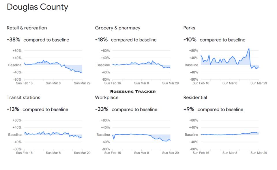 Here is Douglas County's latest Community Mobility Report that shows behavior changes by category from before and after the aggressive distancing measures were put in place. The report charts movement trends over time by geography, across different categories of places such as retail and recreation, groceries and pharmacies, parks, transit stations, workplaces, and residential. Via Google