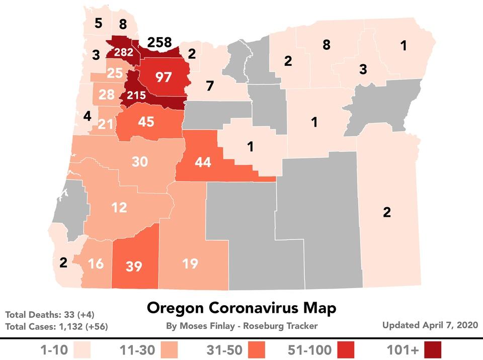 Douglas County had no new cases of COVID-19 today and the total number of positive cases remains at 12. There has now been 3 recovered, 0 deaths, and 443 negative tests for COVID-19. COVID-19 has claimed 4 more lives in Oregon, raising the state’s death toll to 33, the Oregon Health Authority reported at 8 a.m. today. Oregon Health Authority also reported 49 new cases of COVID-19 as of 8 a.m. today. The new COVID-19 cases reported today are in the following counties: Clackamas (7), Clatsop (1), Deschutes (4), Klamath (1), Lane (1), Linn (1), Marion (6), Multnomah (15), Polk (2), Washington (11). Oregon’s 30th COVID-19 death is an 83-year-old female in Marion County, who tested positive on March 28 and died on April 5 at Legacy Meridian Park Medical Center. She had underlying medical conditions. Oregon’s 31st COVID-19 death is a 98-year-old female in Marion County, who tested positive on April 1 and died April 5 in her residence. She had underlying medical conditions. Oregon’s 32nd COVID-19 death is a 71-year-old female in Marion County, who tested positive on March 30 and died April 2 in her residence. She had underlying medical conditions. Oregon’s 33rd COVID-19 death is a 91-year-old female in Washington County, who tested positive on March 27 and died April 6 at Providence St. Vincent Medical Center. She had underlying medical conditions. As of this evening, the US had recorded +33,331 new coronavirus cases today for a total of 400,335. There were also 1,970 new deaths today for a total of 12,841. 731 of those deaths were from New York alone. Oregon Gov Brown announced that the ban on eating in person dining would continue indefinitely. https://www.oregonlive.com/coronavirus/2020/04/ban-on-in-person-dining-extended-indefinitely-in-oregon.html Here is the daily situational report from the State of Oregon https://govsite-assets.s3.amazonaws.com/ApwJeaEtTcmPAIhd7sN7_Oregon-COVID-19-Update-04-06-2020-FINAL.pdf Here is the daily world report from Worldometers https://www.worldometers.info/coronavirus/