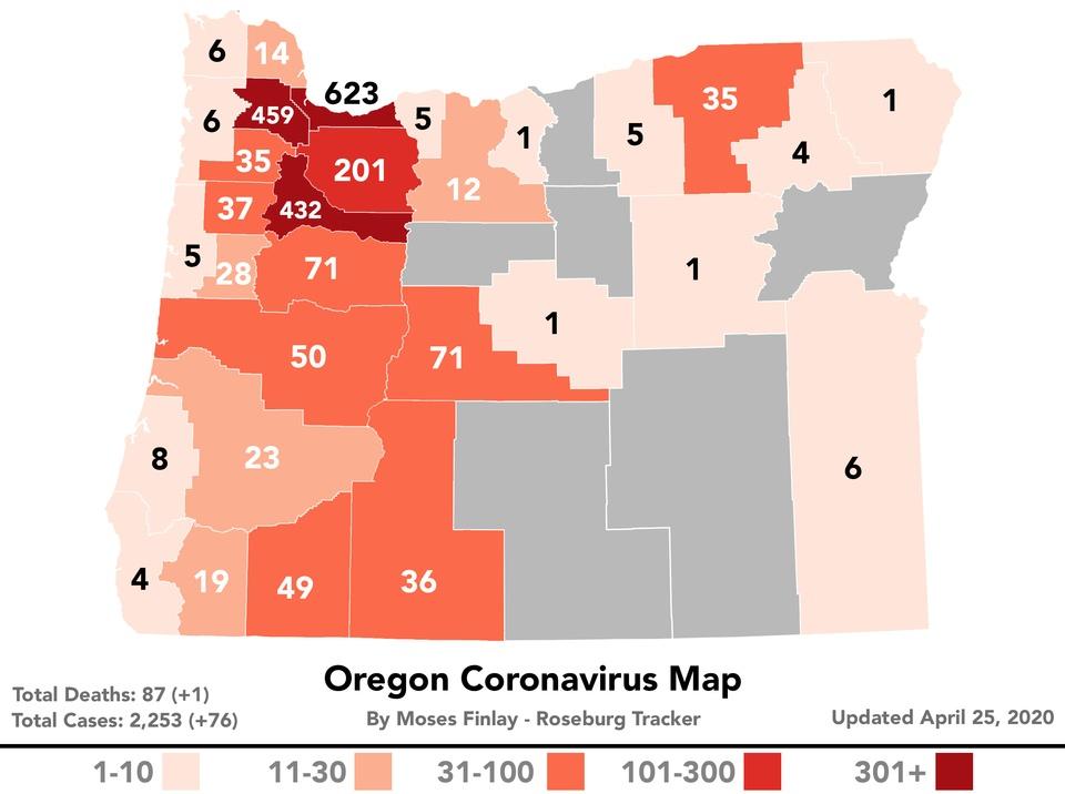 As of 12:00 pm, April 25, 2020, there are no new cases of COVID-19 in Douglas County. The total number of positives in Douglas County remains at twenty-three. Douglas County still has twenty-three positive cases. * Of the twenty-three, fourteen have recovered. There have been zero deaths and 844 negative tests for COVID-19 in the county. Two of the twenty-three people that have tested positive are still hospitalized in different hospitals. COVID-19 has claimed one more life in Oregon, raising the state’s death toll to 87, the Oregon Health Authority reported at 8 a.m. today. Oregon reported 76 new cases of COVID-19 as of 8 a.m. today bringing the state total to 2,253. The new COVID-19 cases reported today are in the following counties: Benton (1), Clackamas (5), Coos (4), Deschutes (1), Jackson (1), Jefferson (3), Linn (4), Marion (15), Multnomah (27), Polk (4), Umatilla (3), Washington (8). Oregon’s 87th COVID-19 death is a 59-year-old man in Lane County, who tested positive on April 14 and died on April 23 at PeaceHealth Sacred Heart Medical Center at RiverBend in Springfield. He had underlying medical conditions.