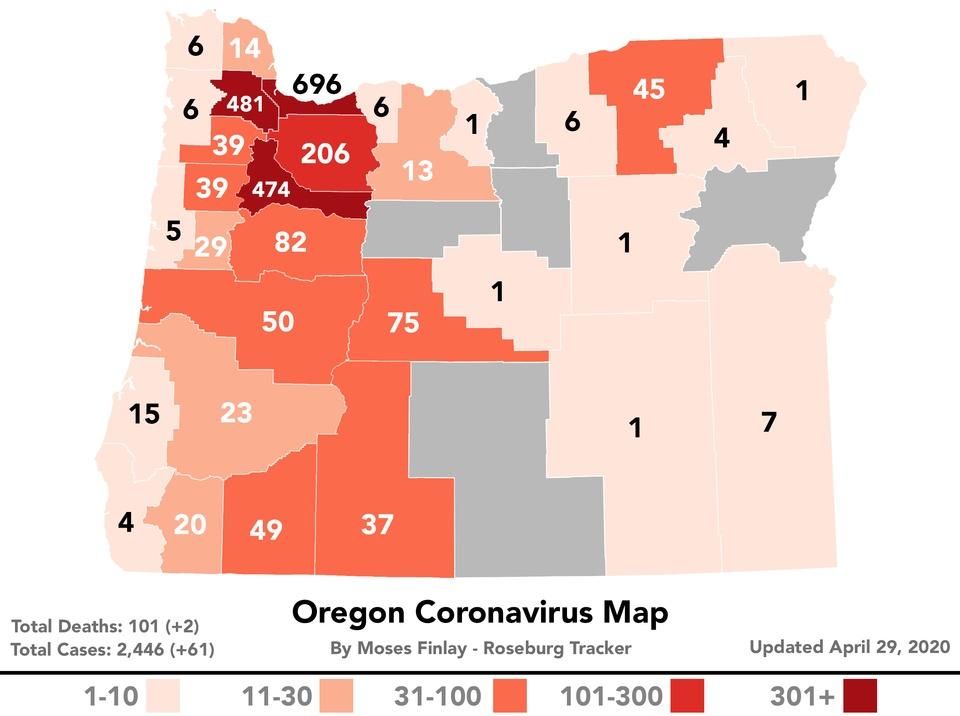 As of 12:00 pm, April 29, 2020, there are no new cases of COVID-19 in Douglas County. For the thirteenth day in a row, the total number of positives in Douglas County remains at twenty-three.* Of the twenty-three, fifteen have recovered. There have been zero deaths and 1023 negative tests for COVID-19 in the county. One of the twenty-three people that have tested positive is still hospitalized. Douglas Public Health Network continues their epidemiological investigations, identifying individuals who may have had close contact with individuals that have tested positive for COVID-19 and advising quarantine. Fifteen of the individuals who tested positive earlier have now recovered. DPHN defines recovery as an end to all symptoms after a positive test for COVID-19. COVID-19 has claimed two more lives in Oregon, raising the state’s death toll to 101, the Oregon Health Authority reported at 8 a.m. today. Oregon Health Authority also reported 61 new cases of COVID-19 as of 8 a.m. today bringing the state total to 2,446. The new COVID-19 cases reported today are in the following counties: Clackamas (1), Hood River (1), Jefferson (4), Linn (1), Marion (18), Multnomah (19), Polk (1), Umatilla (8), Washington (7), Yamhill (1). Oregon’s 100th COVID-19 death is a 75-year-old man in Multnomah County, who tested positive on April 20th and died on April 22nd at his residence. He had underlying medical conditions. Oregon’s 101st COVID-19 death is a 71-year-old woman in Multnomah County, who tested positive on April 11th and died on April 20th at Adventist Hospital. She had underlying medical conditions.