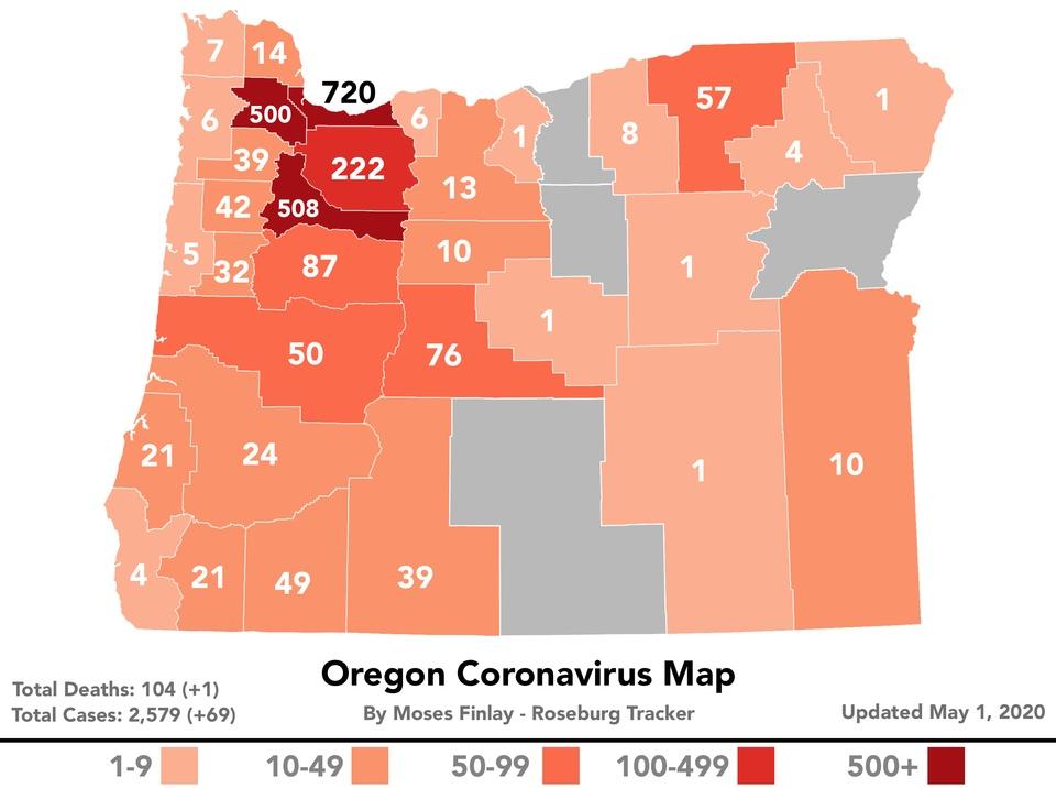 As of 12:00 pm, May 1, 2020, there is one new case of COVID-19 in Douglas County. The new case bumps the total number of Douglas County residents who have tested positive to twenty-four*. However, the newest case, since testing and awaiting the results has been placed on the recovered list. Of the twenty-four cases, eighteen have recovered. One of the individuals that tested positive remains hospitalized. There have been zero deaths and 1058 negative tests for COVID-19 in the county. Douglas Public Health Network continues their epidemiologic investigations, identifying individuals who may have had close contact with individuals that have tested positive for COVID-19 and advising quarantine. The majority of the individuals who have tested positive earlier have now recovered. DPHN defines recovery as an end to all symptoms after a positive test for COVID-19. COVID-19 has claimed one more life in Oregon, raising the state’s death toll to 104, the Oregon Health Authority reported at 8 a.m. today. Oregon Health Authority reported 69 new cases of COVID-19 as of 8 a.m. today, bringing the state total to 2,579. The new COVID-19 cases reported today are in the following counties: Benton (2), Clackamas (8), Clatsop (1), Coos (1), Douglas (1), Josephine (1), Klamath (1), Linn (1), Malheur (2), Marion (17), Morrow (2), Multnomah (13), Polk (3), Umatilla (7), Washington (9). Oregon’s 104th COVID-19 death is a 73-year-old man in Multnomah County, who tested positive on April 14 and died April 29 at his residence. He had underlying medical conditions.