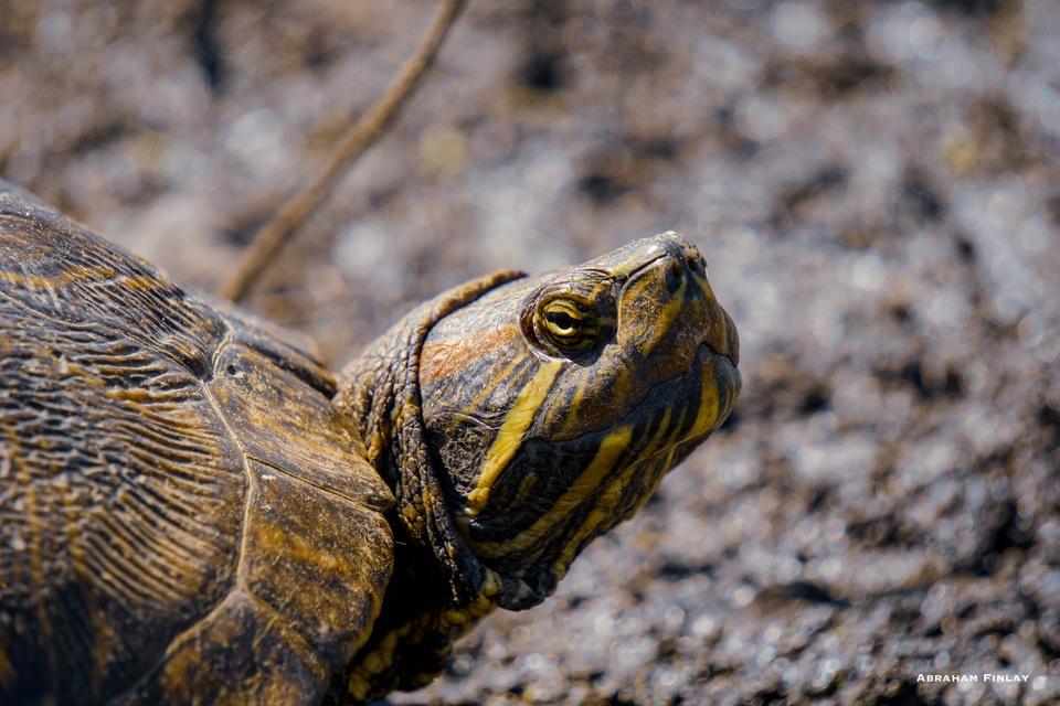 Abraham snapped this amazing photo of a Red-eared Slider turtle this morning at the ponds in Stewart Park. The Red-eared Slider unfortunately is an invasive turtle that competes with native turtles for food and habitat, especially nesting sites. Photo by Abraham Finlay