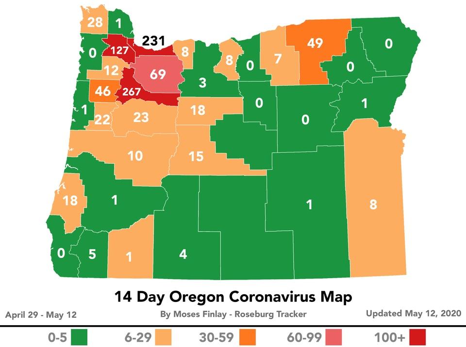 May 12, 2020 and as of 12:00 pm today, there NO new cases of COVID-19 in Douglas County. There has only been one positive case reported in the last 22 days, and that case was reported as recovered before their test results were returned. Testing continues, as DPHN has been holding 2-3 clinics a week and hospitals, urgent cares and clinics continue to test. Twenty-four people have tested positive in the county and twenty-two of those twenty-four have recovered. DPHN defines recovery as an end to all symptoms after a positive test for COVID-19. The state’s death toll from COVID-19 is unchanged from yesterday and remains at 130, the Oregon Health Authority reported at 8 a.m. today. Oregon Health Authority reported 61 new confirmed cases and 11 new presumptive cases of COVID-19 as of 8 a.m. today, bringing the state total to 3,358. The new confirmed and presumptive COVID-19 cases reported today are in the following counties: Benton (1), Clackamas (6), Clatsop (1), Deschutes (4), Jackson (1), Josephine (1), Klamath (1), Linn (1), Marion (29), Multnomah (9), Polk (2), Wasco (1), Washington (14), Yamhill (1).