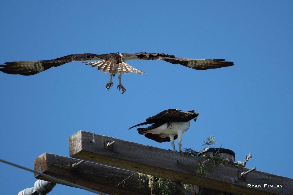 Coming in for a landing! One osprey ducks down as its partner braces for landing this afternoon near the North Umpqua River.
