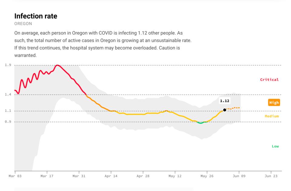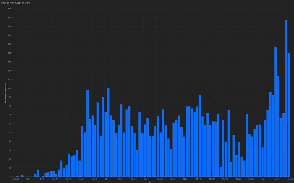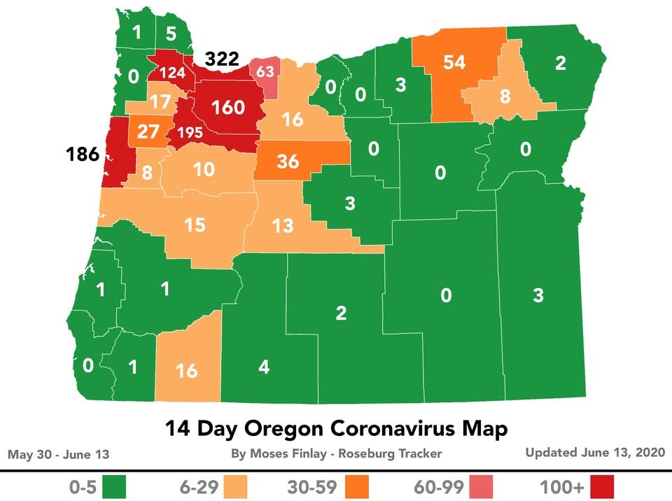 After doing really well into the middle of May, Coronavirus cases and infection rates are now on the rise over the past few weeks in Oregon. Douglas County has had 1 new case in the past 14 days which is good. The increase of cases is spread all over the state and isn't just in one county. This is part of the reason that Oregon Gov Brown put a one week halt on lifting any coronavirus restrictions. They are waiting to see if the numbers continue to rise. This first map is the new cases discovered in the past 14 days in every county around the state. The second image shows new cases going all the way back to February. In the past 6 days, we have had 4 days that would have been record setting new case days before this past week. The third shows the infection rate from March until today.