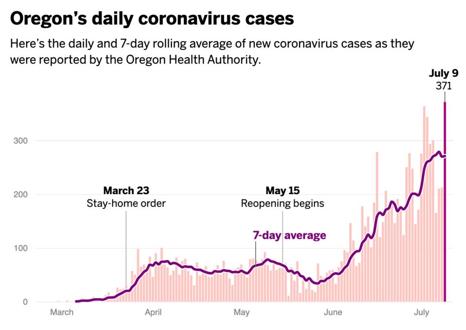 Oregon had 389 new cases and 6 new deaths Thursday. Douglas County added 2 new confirmed cases today, raising our total to 58. (49 confirmed, 9 presumptive) COVID-19 has claimed six more lives in Oregon, raising the state’s death toll to 230, the Oregon Health Authority reported at 12:01 a.m. today. Oregon Health Authority reported 389 new confirmed and presumptive cases of COVID-19 as of 12:01 a.m. today bringing the state total to 11,188. The new cases are in the following counties: Benton (1), Clackamas (20), Clatsop (1), Columbia (2), Coos (4), Crook (3), Deschutes (5), Hood River (1), Jackson (7), Jefferson (8), Josephine (2), Lake (2), Lane (18), Lincoln (15), Linn (3), Malheur (31), Marion (47), Morrow (12), Multnomah (86), Polk (2), Umatilla (55), Union (4), Wallowa (1), Wasco (5), Washington (46), Yamhill (8). Today’s case count is the highest total daily case count since the onset of the pandemic. The recent increase in cases is attributed to workplace outbreaks and community spread. Newly diagnosed cases are being interviewed now. Oregon’s 225th COVID-19 death is a 63-year-old woman in Crook County who became symptomatic on July 1 after close contact with a confirmed case and died on July 8, at her residence. She had no underlying medical conditions. Oregon’s 226th COVID-19 death is an 83-year-old man in Umatilla County who tested positive on July 4 and died on July 3. The place of death is being confirmed. He had underlying conditions. Oregon’s 227th COVID-19 death is a 71-year-old man in Marion County who tested positive on June 26 and died on July 7, at his residence. He had underlying medical conditions. Oregon’s 228th COVID-19 death is a 75-year-old woman in Clackamas County who tested positive on June 10 and died on July 2 at Providence St. Vincent Medical Center. She had underlying medical conditions. Oregon’s 229th COVID-19 death is a 78-year-old woman in Clackamas County who died on June 18 at her residence. More details are pending. Oregon’s 230th COVID-19 death is a 90-year-old man in Marion County who tested positive on May 9 and died on June 1, at his home. He had underlying conditions. https://www.oregonlive.com/news/2020/07/daily-coronavirus-count-reaches-record-breaking-heights-with-389-new-cases-and-6-deaths-on-thursday-state-officials-report.html