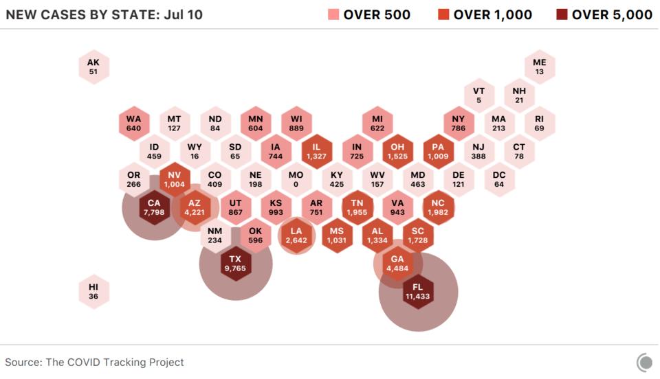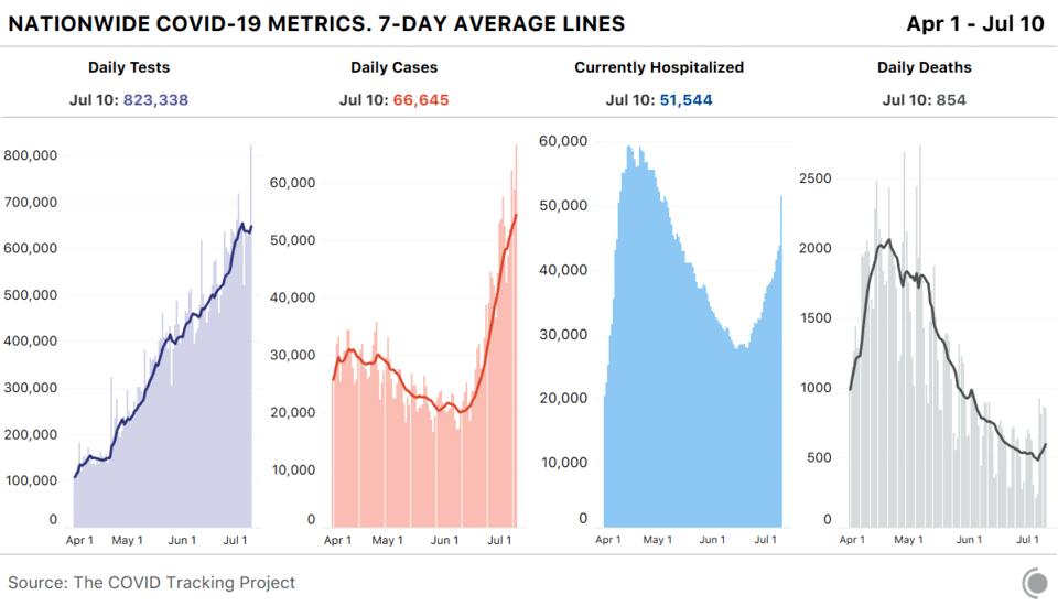 Douglas County announced 3 more cases Friday, 2 confirmed and one presumptive. This brings the total cases to 60, 50 confirmed and 10 presumptive. One confirmed case was taken off the official total when it was discovered they actually reside in another state. COVID-19 has claimed two more lives in Oregon, raising the state’s death toll to 232, OHA reported at 12:01 a.m. today. OHA reported 275 new confirmed and presumptive cases of COVID-19 as of 12:01 a.m. today, bringing the state total to 11,454. The new cases reported today are in the following counties: Baker (1), Benton (6), Clackamas (11), Crook (1), Deschutes (8), Douglas (2), Hood River (4), Jackson (9), Jefferson (15), Josephine (2), Lane (10), Linn (3), Malheur (21), Marion (28), Morrow (3), Multnomah (37), Polk (3), Tillamook (1), Umatilla (51), Union (1), Wallowa (1), Wasco (5), Washington (44), Yamhill (8). Oregon’s 231st COVID-19 death is a 62-year-old man in Union County who tested positive on June 16 and died July 2 at Saint Alphonsus Regional Medical Center in Boise. He had underlying medical conditions. Oregon’s 232nd COVID-19 death is a 99-year-old woman in Lincoln County who tested positive on June 26 and died July 9. Location of death is being confirmed. She had underlying medical conditions. Graphics - Covid tracking project