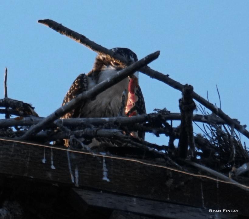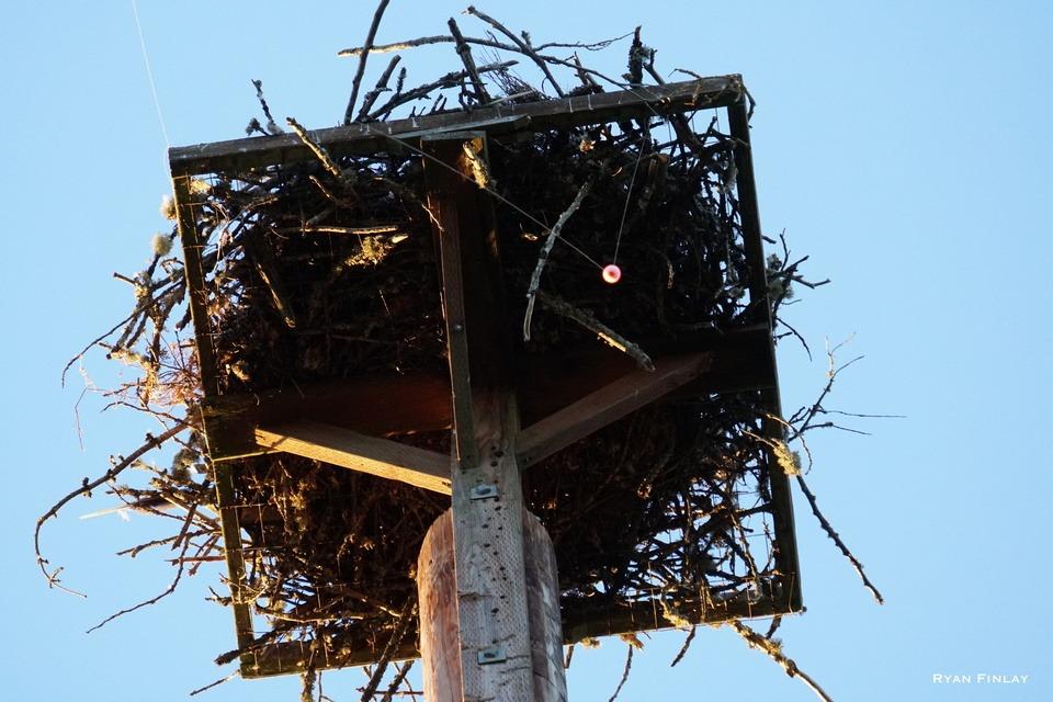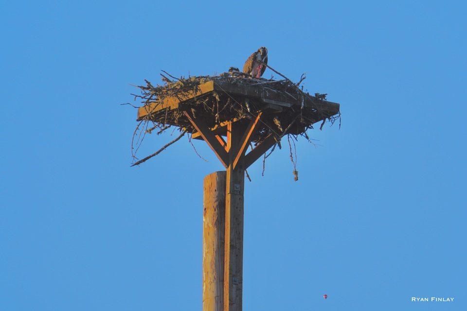 An Osprey at the nest in Stewart Park eating a fish this evening. Unfortunately, it likely still had the hook in it as the fishing line and a bobber are now dangling down from its nest. Let's all hope it does not consume the hook as it can often times be fatal to the bird.
