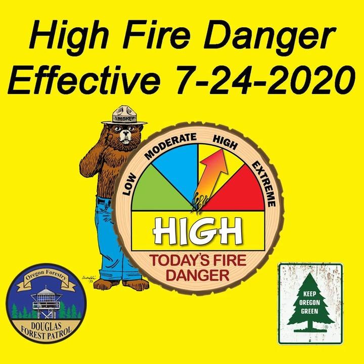 (DFPA) The Douglas Forest Protective Association will increase the fire danger to “HIGH” (Yellow) on all 1.6 million acres of private, county, state, Bureau of Land Management, and Bureau of Indian Affairs lands within the Douglas District, effective Friday, July 24th. The Industrial Fire Precaution Level will remain at IFPL II. Under DFPA’s Public Use Restrictions, a high fire danger rating changes the shutdown times for several activities for the general public. During high fire danger, the following activities are prohibited between the hours of 10:00 AM and 8:00 PM: • The cutting, trimming, or mowing of dried or cured grass. This restriction does not apply to the mowing of green lawns or for the commercial culture and harvest of agricultural crops. • The cutting, grinding, or welding of metal for non-industrial purposes. • The use of power saws for non-industrial purposes. • Any non-industrial improvement or development taking place on private property that utilizes power driven machinery not specifically mentioned in the Public Use Restrictions. All other restrictions listed under DFPA’s Public Use Restrictions remain in effect and unchanged. A complete list of DFPA’s Public Use Restrictions can be found online at www.dfpa.net or by calling DFPA’s 24 hour information line at 541-672-0379. Residents are reminded that additional restrictions or closures may be in place through private industrial landowners or public land management agency on the lands they own or manage.