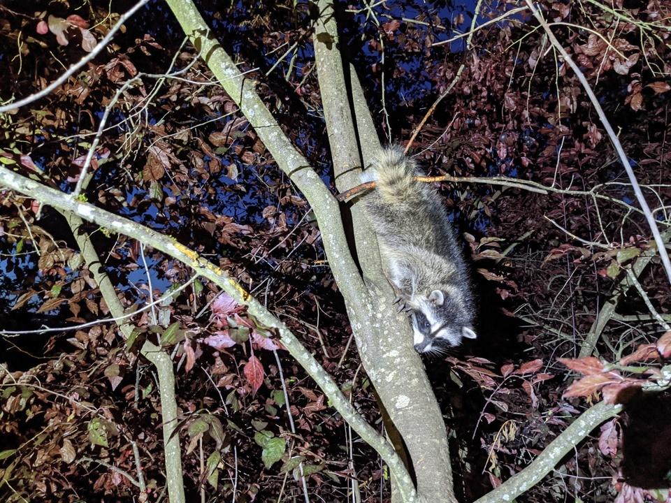 Late this evening Abraham and I got called out to a house that had the juvenile raccoon who got its leg stuck in between two branches. The raccoon had been stuck since this morning. Because it was dark we decided to carefully cut the tree down so it would go horizontal. We were either going to capture it and put it in a crate for examination or hope that it would be able to release itself. It ended up being able to free itself once the tree with horizontal! Once free it jumped down the hill towards its mother who was still hanging out in the area. Big thank you to Ashley, Michelle, Kristine, Jared for cutting down the tree, Britain, Jamie and Abraham. Excellent teamwork!