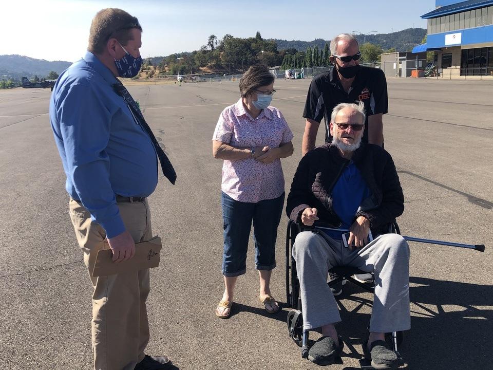 John Blanton had one of his last wishes fulfilled on August 28th, 2020 at Roseburg Regional Airport. John, who formerly was a private pilot, long dreamed of flying in a plane one final time. As he and Mercy Hospice Chaplain Sabin Gautreau met over the past few months, John’s wish came to light. When Sabin found out that he loved to fly, he asked, “Would you go up again if you had the chance?” John didn’t even blink. Instead, with a huge smile beaming across his face, he said, “Of course!” Flying runs in John’s family as both of John’s brothers were pilots – one served in that capacity in the Navy on the famous carrier Enterprise. So with this family history in mind and a chance to keep John smiling, Sabin set into motion a plan to get him off the ground and into the air one more time. When initial plans didn’t work out, Sabin reached out to one of Mercy’s former Chaplains for help who also happens to be an experienced aviator. Byron Gingrich has his own private plane and has been flying since he was 18 years old. Of course, Byron said he’d love to help. Byron graciously flew in from Salem and took John for the trip. They both seemed at home in the sky and very much enjoyed taking in the stunning view. John peppered Byron with questions throughout the flight. “How fast are we going?” “Normally, when I’m in a plane, I’m the pilot. This time I’m the passenger.” “I’m not crying because I’m sad. I’m crying because I’m so excited!” John’s family, a neighbor and Mercy Hospice staff joined John at the Roseburg Airport to cheer him on during this last flight. This is just one of the beautiful experiences in the life of a hospice chaplain. Sabin describes the role as “ Fulfilling….we get to add value to lives, help people walk through their spiritual pain, and provide comfort and encouragement to those who are bravely approaching their final chapter on earth.” “We like to serve all clients, but people like John are particularly a joy,” says Sabin. Mr. Blanton has invested time in the community. He worked in the police force for over 20 years, spending some of that time in Roseburg. His late wife, Donna, who passed less than a year ago, shared his love for flying. “Part of the reason I wanted to go up is because we used to fly together” he said. And that makes us Mercy Proud! Story and photos courtesy of Mercy Hospice