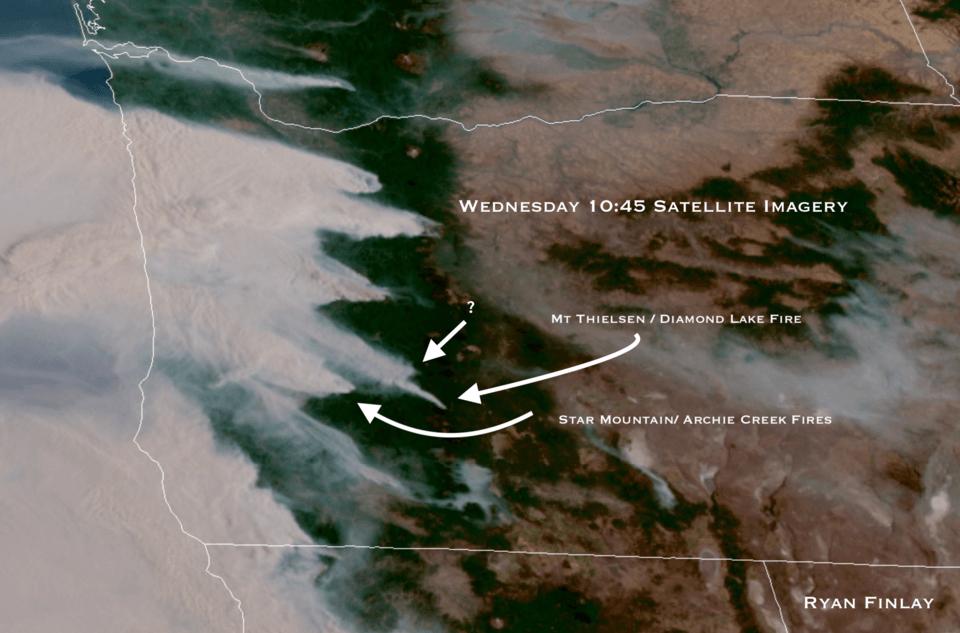 Here is the latest satellite imagery of the Oregon fires. Smoke is blowing to the NW right now. You can see the new fire at Mt Thielsen/Diamond Lake now. There is another fire to the NW of that one that I'm not sure about. I think its new. More updates to come.