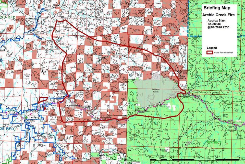 (DFPA) Hi everyone…quick update on the fire situation. The Star Mountain Fire and Archie Creek Fire have merged together as was expected to happen. Going forward, this incident will be known as the Archie Creek Fire. This morning, representatives from DFPA, the Umpqua National Forest and Roseburg BLM met with the incoming Incident Management Team to give them a briefing on the incident. Northwest Interagency Incident Management Team 9 will assume command of the fire this evening. The Public Information Officers with Team 9 will be setting up a Facebook Page, InciWeb page, and an information phone line dedicated to this incident. Once these platforms are created, we will make sure to share that information. Yesterday’s fire activity was explosive to say the least. As you will see from the map with this post, the fire is estimated to have burned 72,000 acres in roughly the first 12 hours after ignition. This map was created late last night from observations from the field rather than from IR flight data so the acreage total could be slightly higher or lower. The plan is to get a IR flight in the near future to get a more precise fire perimeter / fire size. We’ve also had many people call and ask about homes in the area. At this time, we do not have information about specific homes but we have been told by the structural protection resources that structures have been lost on this fire and fire officials are working to collect that data. Unfortunately, DFPA’s Rock Creek Guard Station was one of the structures that was lost. As for evacuations, fire personnel are working with the Douglas County Sheriff’s Office to determine when / where evacuation notices are issued or removed. Those notices are posted on DCSO’s facebook page and website. Please follow the advice of fire / law personnel if you are asked to evacuate. If you choose to stay after you have been asked to leave, please understand that fire personnel MAY NOT BE ABLE TO PROTECT YOU OR YOUR HOME.