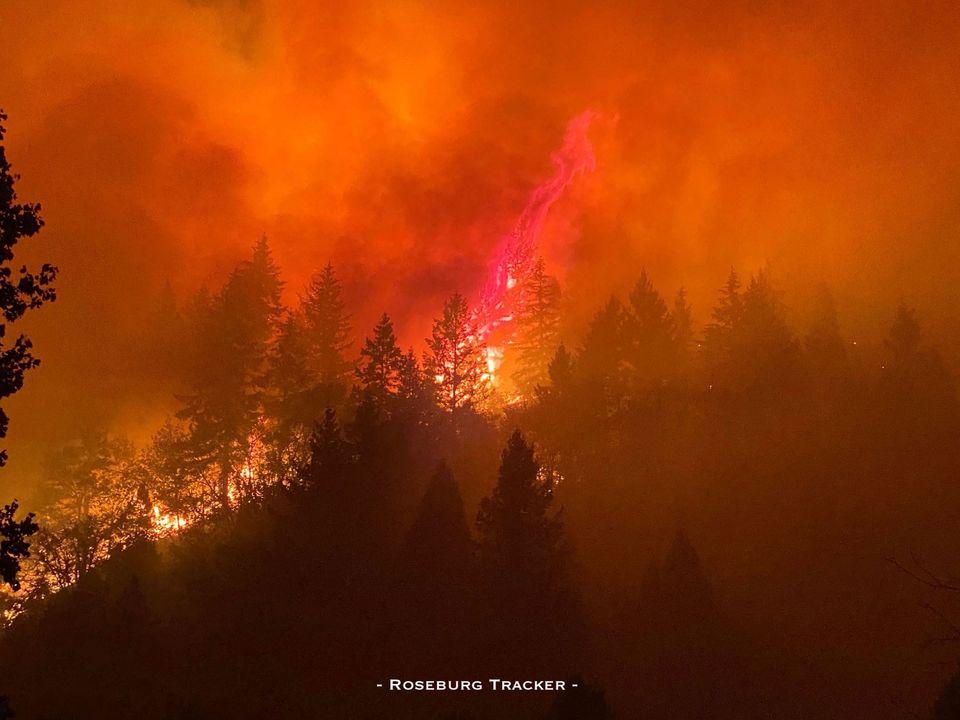 The Archie Creek fire grew 8,365 acres since yesterday and now stands at 115,857 acres. (Roseburg District BLM) Current Situation: The Archie Creek Fire burning east of Roseburg is now 115,857 acres with 0% contained. It is burning in the North Umpqua drainage on the west slope of the Cascades. Today fire managers will continue assessment of the fire. They are working with local fire departments on structural protection and fire line construction as weather conditions allow. Line construction continues on west and southwest flanks, utilizing heavy equipment in cooperation with local timber companies. ODOT is working to clear Highway 138 E for fire traffic only. Pacific power is working to restore and protect lines and infrastructure. Structural fire departments are working directly with residents and on damage assessments. Firefighter and public safety is a concern and access to fire areas is limited at this time due to smoke inversion and blocked roads. Residences and commercial properties continue to be evacuated. Large tracts of private and federal timberlands continue to be threatened. Electrical transmission lines are damaged or are threatened. Forest recreation areas are impacted. Recreational resorts are closed due to the fire. Northwest Team 9 (I.C. Goff) is working with the Umpqua National Forest, the Roseburg Bureau of Land Management (BLM), Douglas Forest Protective Association (DFPA), Douglas County Sheriff’s Office, Search and Rescue, local fire departments and local loggers. Public briefing: Archie Creek Fire Officials will hold a virtual public briefing today, Friday, Sept. 11, 2020 at 2:00 pm. This will be a live stream video information briefing regarding the fire affecting several communities in Douglas County. Please check the Archie Creek Fire Information Facebook page for a link to the live video beginning at 1:55 pm. The briefing will begin at 2:00 pm. Current Evacuations: LEVEL 1 "BE READY": ALL DOUGLAS COUNTY RESIDENTS SHOULD BE IN THIS LEVEL OF READINESS AT ALL TIMES. LEVEL 2 "BE SET:” Nonpareil Road 4400-7500 block (Including Fair Oaks Road, Fraser Canyon, Bonanza Mine, Plat K) LEVEL 3 "GO!": LEAVE IMMEDIATELY! Dry Creek (Happy Creek Ln, Felix Flat, Elk Ridge, Illahee) Steamboat Creek to Little River Road in Glide (Includes all addresses between these points, Includes the towns of Idleyld Park and Glide) All of Little River Road The end of Nonpareil Road west to Banks Creek Road Shelter: Douglas County has an evacuation location for displaced wildfire residents, pets and livestock. Information about space availability at the Fairgrounds, contact the Fairground Office at 541-440-4394. For information on shelter for horses and large animals, contact the Douglas County Parks Department at 541-440-6040. For small animals (cats, dogs, birds, etc.), contact Saving Grace at 541-672-3907. For other small animals like pigs, sheep or goats, contact the Douglas County Fairgrounds for space information. The American Red Cross, working in conjunction with the Salvation Army, has set up a temporary Emergency Shelter in Douglas Hall at the Douglas County Fairgrounds. For more information, please contact the American Red Cross and the Salvation Army directly. You can reach the Salvation Army at (541) 672-6581 and the American Red Cross at (541) 344-5244. Safety of evacuated areas: Douglas County deputies and troopers from the Oregon State Police are patrolling residential areas in an effort to deter and detect criminal activities during the evacuation period. Residents who have video surveillance or cameras, should call and report any suspicious activity they observe. The Sheriff's Office has created a page on its website which contains maps of the current evacuation zones. The maps attempt to provide a visual of the most current evacuation zones by showing roads and specific addresses in some cases. The maps can be found at www.dcso.com/evacuations and are updated as quickly as possible. Air quality: The Oregon Department of Environmental Quality has issued an Air Pollution Advisory for today. For more information, visit http://www.oregon.gov/deq Closures: Highway 138 East remains closed to non-fire traffic between Milepost 17 and Highway 97 junction. Motorists are advised to use alternative routes and to monitor www.tripcheck.com for updates on the highway closure. All Bureau of Land Management (BLM) managed lands, east of Interstate 5, within the Swiftwater Resource Area are closed. Umpqua National Forest lands in the fire area are also closed. See the forest Facebook pge for updates. Photos sent into Roseburg Tracker of Idleyld Park of the fire early morning hours on Thursday.