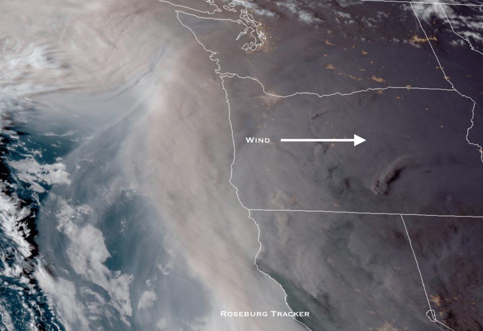 The wind is starting to blow the smoke off to the east now as you can see from this satellite shot right before sunset. The problem is there is thick smoke for hundreds of miles out to the west that needs to be cleared up. It might not be cleared up until sometime early this next week. Let us hope that it happens sooner. Side note, once the smoke starts clearing it we might see an increase in fire activity as the current smoke is kind of smothering the fire. We'll shall see.