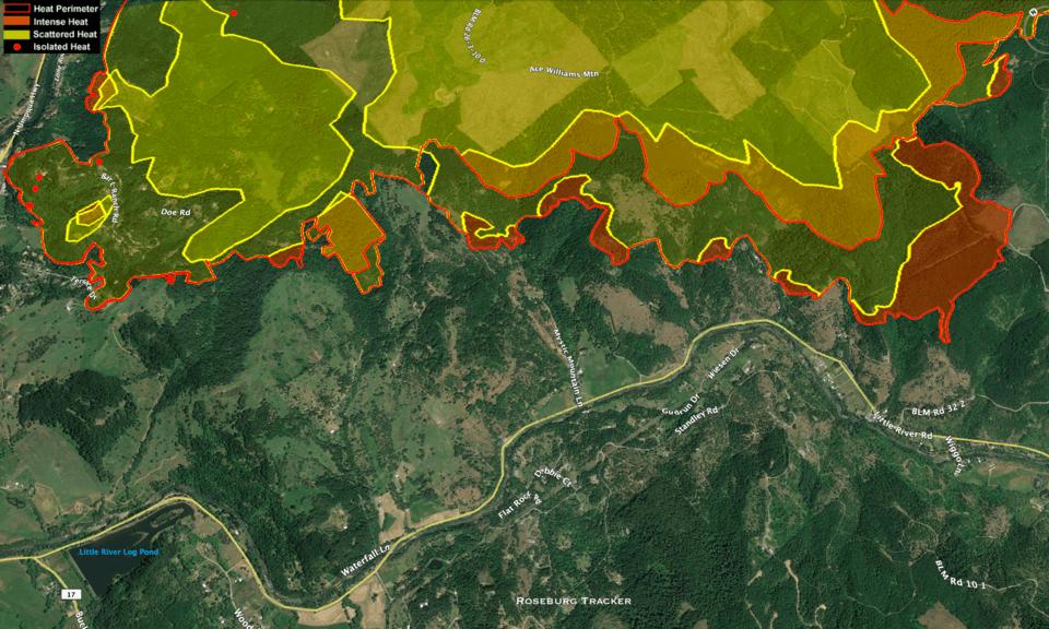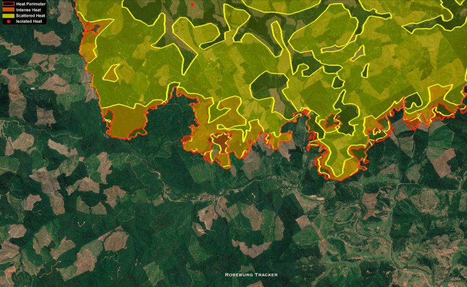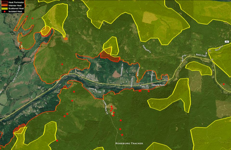 The Archie Creek Fire is now 121,379 acres an increase of 5,522 acres over the past day or so. Reminder, on these IR fire maps. The maps are meant to inform on approximate boundaries, not the specific case by case property status. Hope these are helpful! Here are the latest notes from the IR flight that took place overnight. “Areas of intense heat and heat perimeter growth were detected around the majority of the heat perimeter tonight. One large area of growth is south of the Umpqua River, east of Glide, near Peel where the heat is backing down off the hills to the north (Bob Butte and Buck Rock). To the east, intense heat is on both sides of Shivigny Mountain and expanding eastward. To the east, north of the Umpqua River, the fire is cooler, without much expansion. East of Panther Ridge within the National Forest, intense heat is moving downhill, with a number of isolated areas of heat. The far SE part of the fire had a large area of perimeter growth with intense heat along the south banks of the North Umpqua River east of Panther Ridge. Continuing to the north along the east side of the perimeter, there was growth along the Steamboat Point area, but no intense heat. NW of there, the heat is backing down into the Canton Creek drainage, from Bloody Point to the NW to Trapper Creek. To the west, there were two larger areas of very intense heat, one on the north side of the East Fork Rock Creek and in the upper part of the Surprise Creek drainage. Intense heat is backing down the knob between Hurry Up Creek and Northeast Fork Rock Creek. Continuing to the east, there are several areas of intense heat backing downhill into the main Rock Creek drainage. To the northwest, there is some heat perimeter growth on the south side of South Fork Calapooya Creek. On the west part of the perimeter, there was perimeter expansion to the east and uphill of the community labelled Hawthorne. Further to the SW, the heat is backing down into Hinkle Creek, where structures are shown on the topo map. Along the rest of the western perimeter, areas of intense heat were detected near Field Creek, Slide Creek and Gassy Creek. To the south, there were small areas of heat perimeter growth in the upper reaches of Huntley Creek. From there down to Glide, the perimeter was relatively cool, with very minimal growth.”