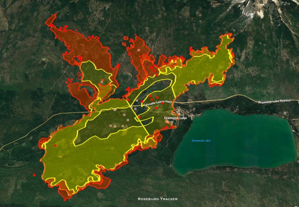 Here is the latest maps of the Mt Thielsen fire up at Diamond Lake. The fire is now 7,778 acres, an increase of 1,848 acres over the past day or so. Most of the fire's growth has been to the NW. There is a fire aircraft on this fire now that has been scooping water out of Diamond Lake as of Monday.