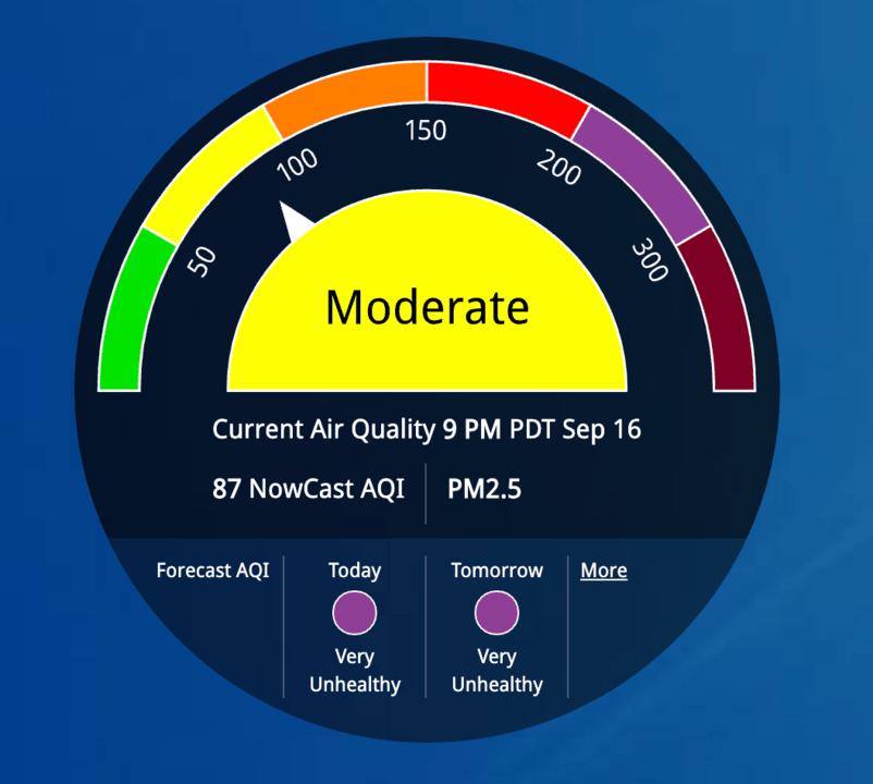 The AQI for Roseburg is down to 87 as of 9:45 pm Wednesday night.