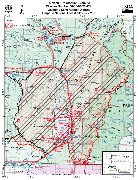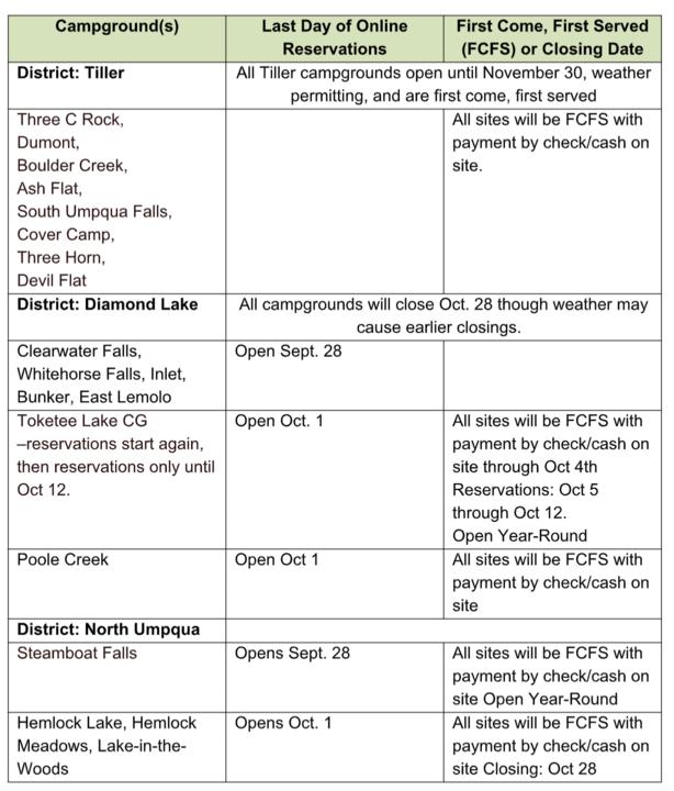 ROSEBURG, Ore., Sept. 27, 2020 -- Beginning at 12:00 noon Monday, September 28, the Umpqua National Forest is re-opening much of our public lands to recreational users. Cottage Grove and Tiller Ranger Districts will be re-opened in their entirety, to the public for use in addition to large portions of North Umpqua and Diamond Lake Districts. Due to active fire and fire suppression activities, sections of the North Umpqua and Diamond Lake Districts will remain under a fire closure order (see proposed closure area maps). The Umpqua Hot Springs, fire lookouts, cabins, and group picnic sites will remain closed. There will be both reserved and first come, first served campsites available. Please see the list below for open campsites, check the Umpqua National Forests website at: http://bit.ly/2Hhu4Dx or call your desired district office, M – Fr, 8:00 a.m. to 4:30 p.m.) for the most up-to-date list of available campgrounds. Most facilities, such as vault bathrooms, will remain open for public use. Members of the public wishing to utilize these facilities are doing so at their own discretion and must take all necessary precautions to account for their own personal health and safety. While we are following all CDC guidelines for the cleaning of public spaces we cannot guarantee a COVID free facility.