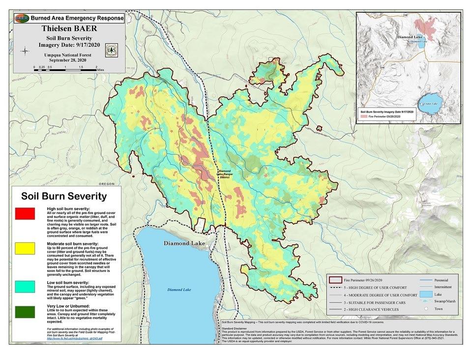 (Umpqua National Forest) The Thielsen Fire BAER team finalized their first science-based assessment product: the soil burn severity map. Soil scientists analyze satellite imagery captured immediately before and after the fire to map how dramatic the landscape has changed. Based on what they see in the satellite imagery, their experience in the area, and any ground-based observations they make, the team creates this map product. The soil burn severity map is just the first step in an assessment process that includes modeling of erosion and debris flow potential, for example. Link: https://inciweb.nwcg.gov/incident/article/7222/57165/